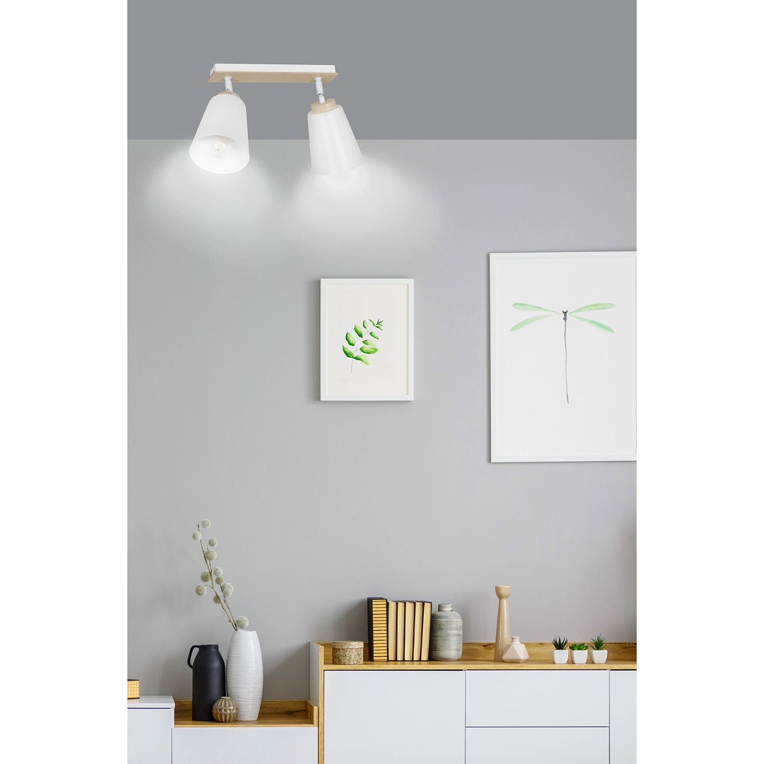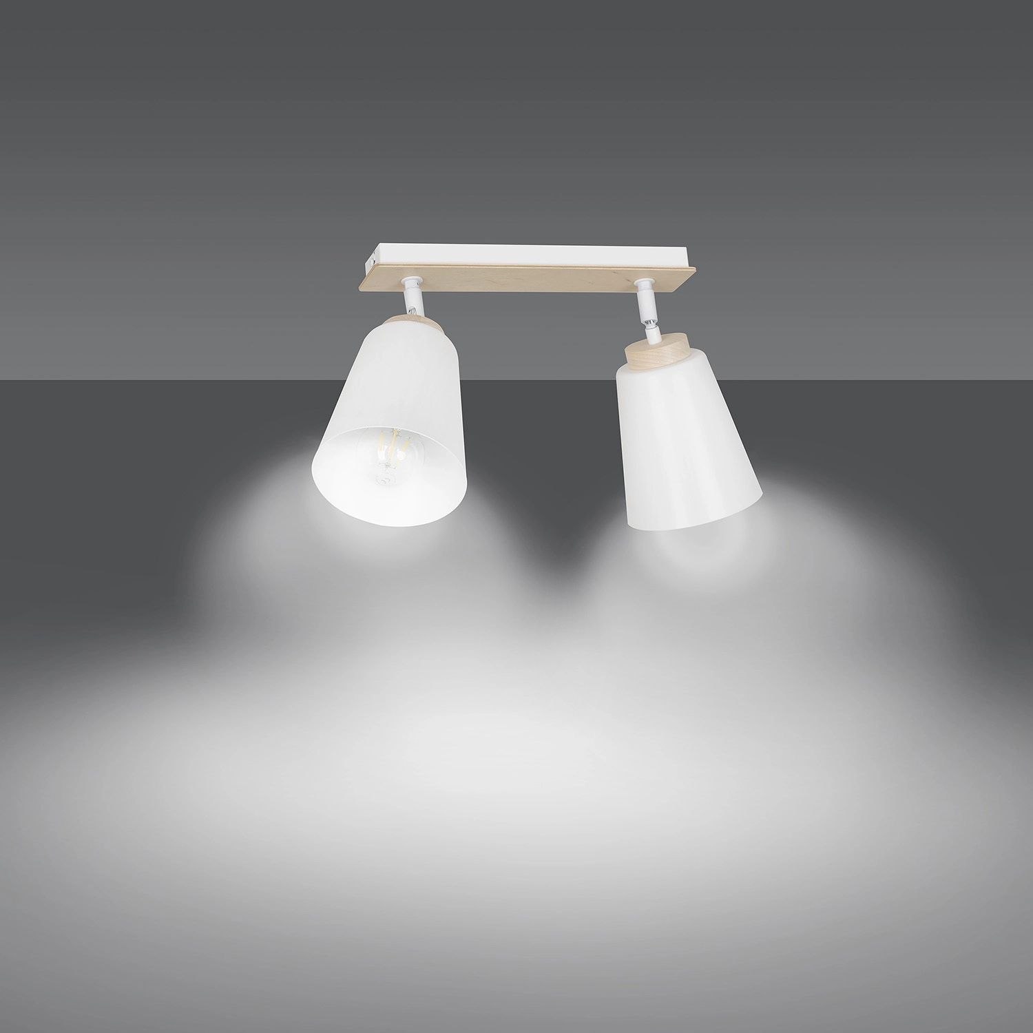 Lampada spot moderna in stile scandinavo 2 luci con base rettangolare in metallo di colore bianco e 2 paralumi regolabili in metallo con dettagli decorativi in legno naturale. Perfetto per stanze dal soffitto basso. La loro classica combinazione di colori con elementi in legno conferisce alla lampada un carattere unico e distintivo. L'intera costruzione è stata progettata con attenzione al più piccolo dettaglio.