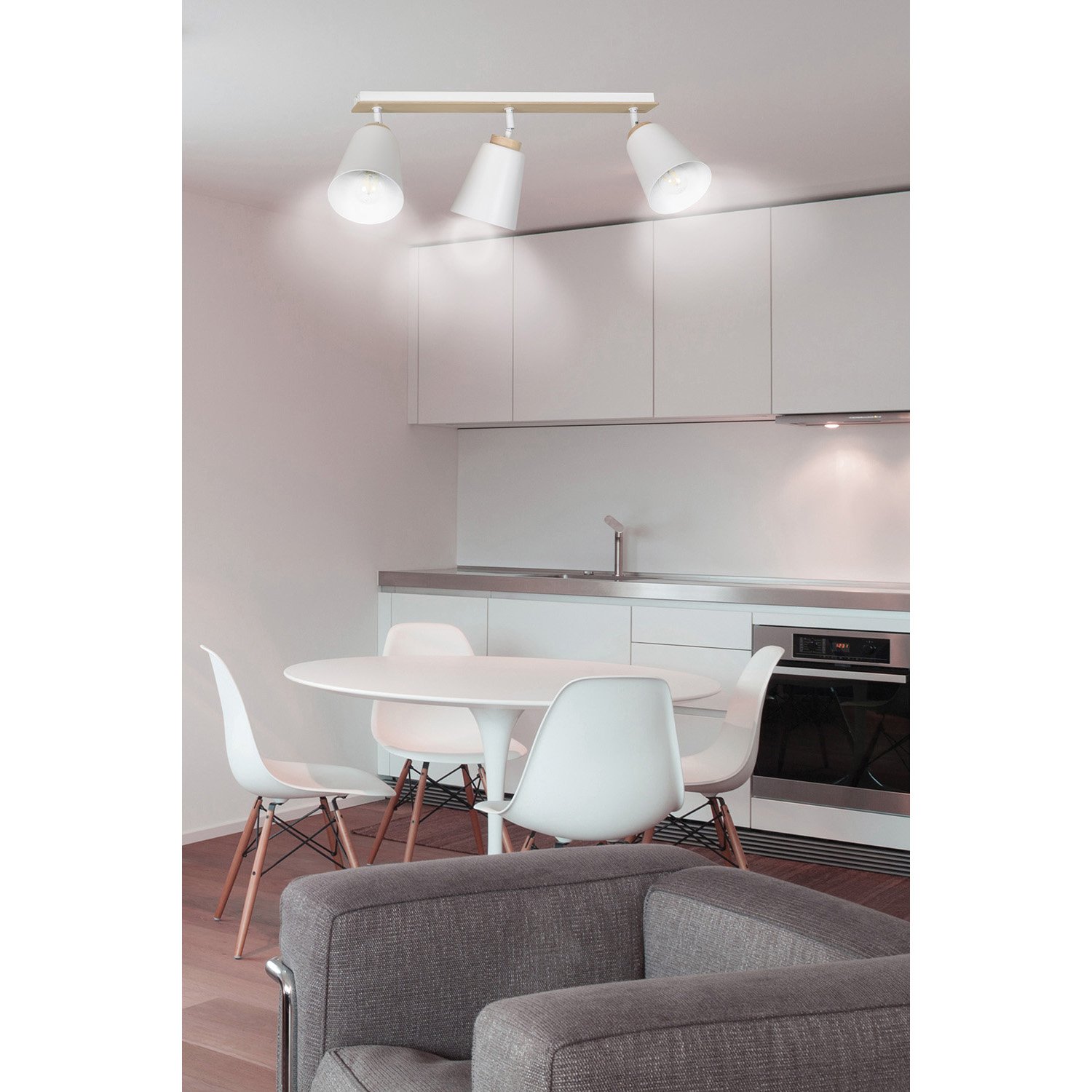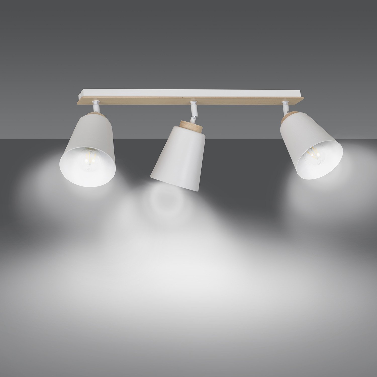 Lampada spot moderna in stile scandinavo 3 luci con base rettangolare in metallo di colore bianco e 3 paralumi regolabili in metallo con dettagli decorativi in legno naturale. Perfetto per stanze dal soffitto basso. La loro classica combinazione di colori con elementi in legno conferisce alla lampada un carattere unico e distintivo. L'intera costruzione è stata progettata con attenzione al più piccolo dettaglio.