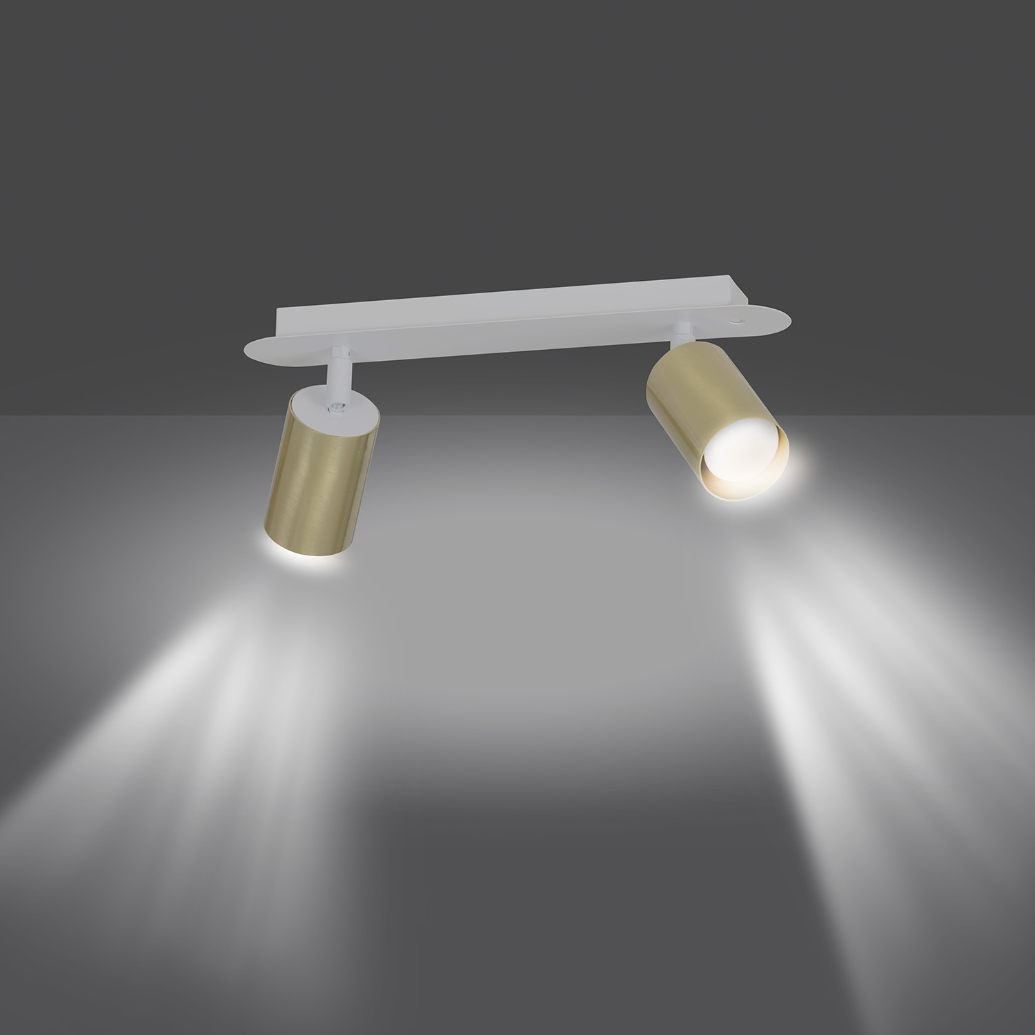 Lampada spot moderna a 2 luci realizzata con una base in metallo di colore bianco con bracci e due paralumi cilindrici regolabili in metallo color oro. Le lampade si distinguono per il design e la forma semplici che si adattano perfettamente a qualsiasi disposizione. La luce focalizzata e direzionale li rende ideali come illuminazione aggiuntiva sopra il bancone della cucina, in un corridoio o accanto a un comodino.