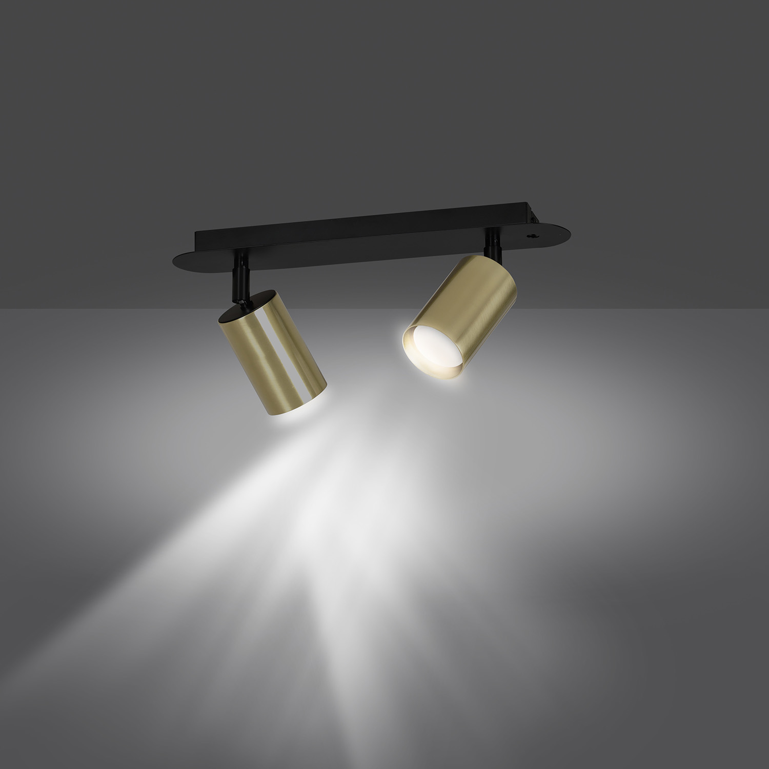 Lampada spot moderna a 2 luci realizzata con una base in metallo di colore nero con bracci e due paralumi cilindrici regolabili in metallo color oro. Le lampade si distinguono per il design e la forma semplici che si adattano perfettamente a qualsiasi disposizione. La luce focalizzata e direzionale li rende ideali come illuminazione aggiuntiva sopra il bancone della cucina, in un corridoio o accanto a un comodino.