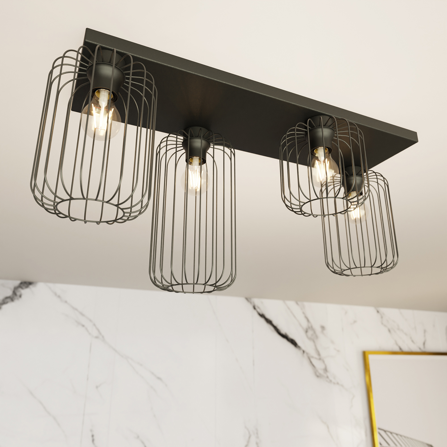 Collezione VulcanoOGNI SCELTA PARLA DEL TUO STILEPlafoniera 4 luci E27 in acciaio verniciato a polvere effetto gabbia, con rosone rettangolare. La lampada da soffit..