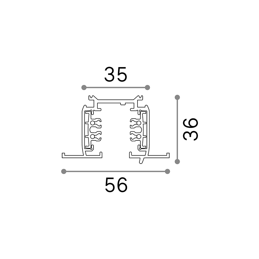 Profilo di alluminio estruso per binari elettrificati trifase;. verniciatura a polveri in bianco o nero, ottimizzato per proettori SMILE in versione on-off e per proiettori QUICK in versione on-off e dimmerabile DALI e 1-10V