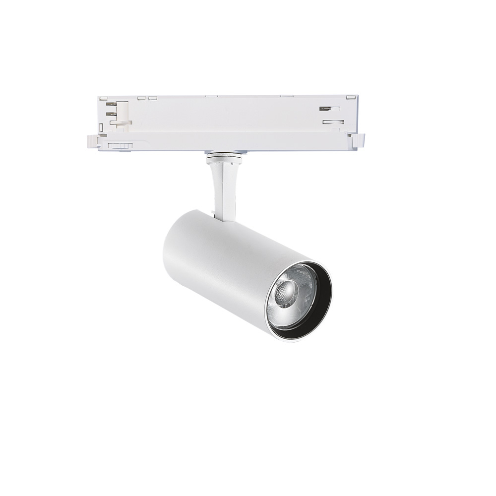 Proiettore cilindrico in alluminio estruso, adatto per installazione su binario trifase.. Verniciatura a polvere, testa girevole e orientabile, il driver di alimentazione è incluso e trova alloggiamento nel corpo cilindrico.