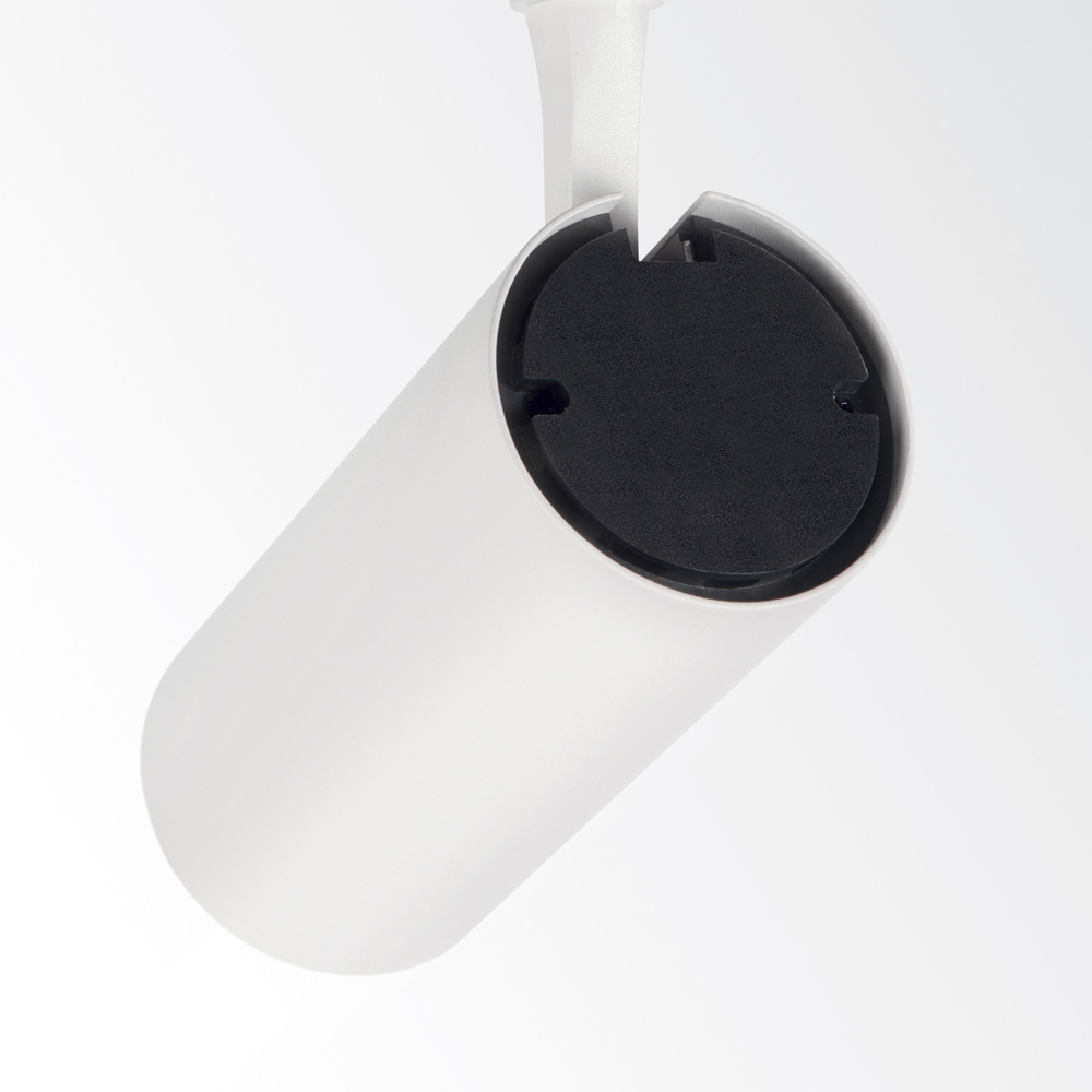 Proiettore cilindrico in alluminio estruso, adatto per installazione su binario trifase.. Verniciatura a polveri in bianco o nero, testata girevole 275° e orientabile fino a 90°; il driver di alimentazione è inclusomento nel corpo cilindrico.