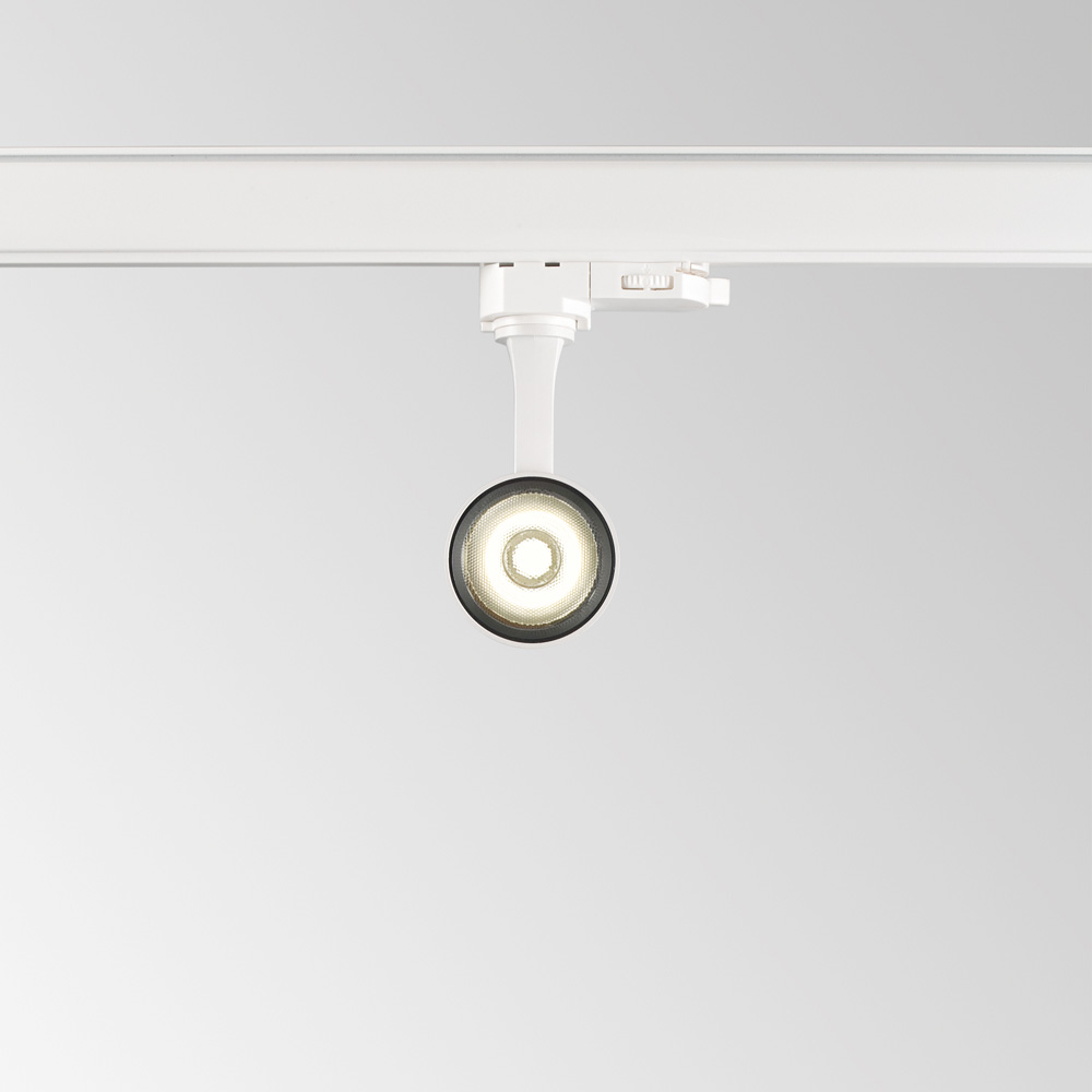 Proiettore cilindrico in alluminio estruso, adatto per installazione su binario trifase. . Verniciatura a polveri in bianco o nero, testata girevole e orientabile, il driver di alimentazione è incluso e trova alloggiamento nel corpo cilindrico.
