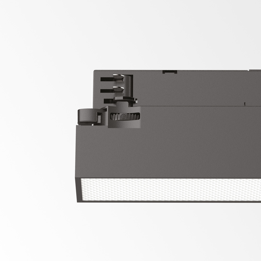 Supporto lineare montato su binario per interni con sorgenti LED integrate ed emissione di luce diretta, struttura in alluminio verniciato a polvere .