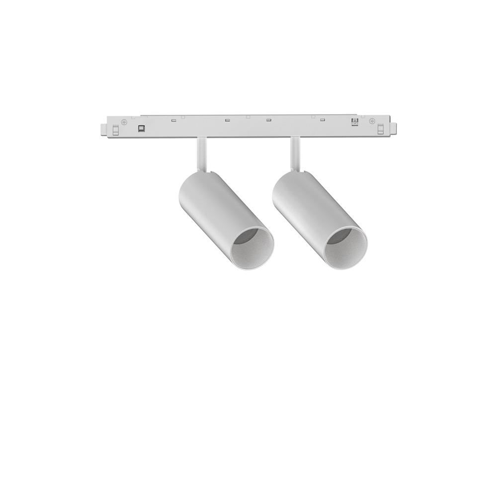Proiettore regolabile e dimmerabile montato su binario per interni con multiple sorgenti LED integrate da 24W ed emissione di luce diretta.. Sistema composto da un profilo in alluminio estruso ed elementi di illuminazione a fissaggio magnetico