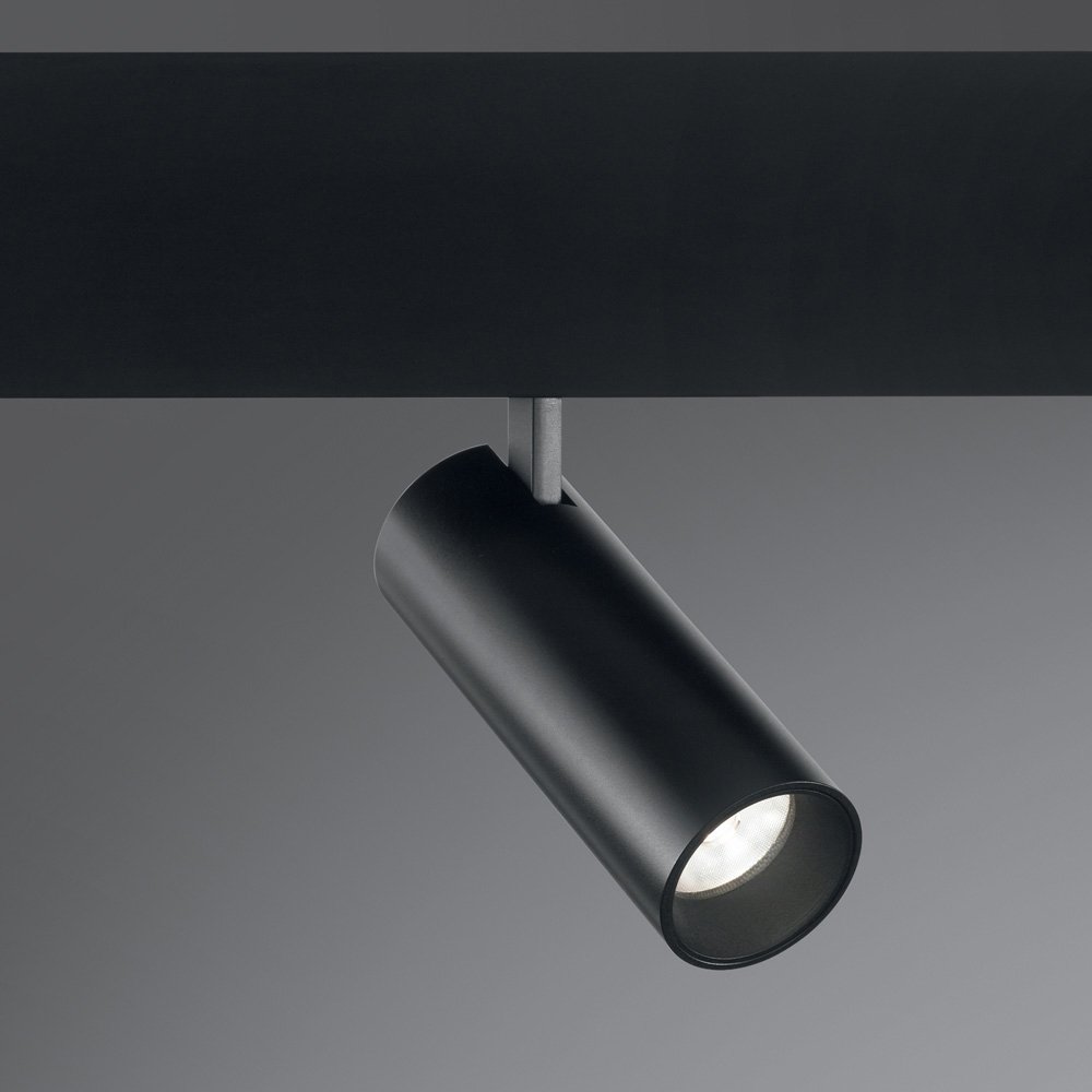 Sistema lineare a basso voltaggio con un'ampia gamma di moduli componibili a fissaggio meccanico.. Il sistema è in alluminio estruso anodizzato e verniciato nero, disponibile nella versione a plafone, a sospensione oppure a incasso.