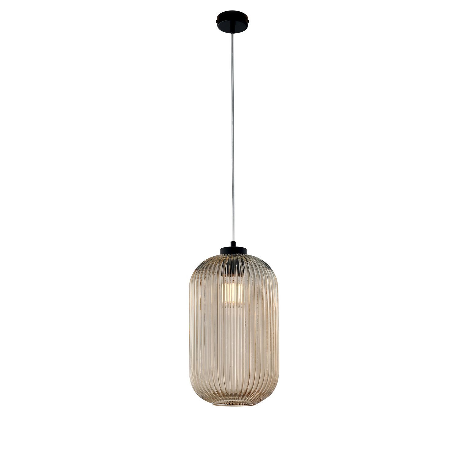 Sospensione a una luce in ferro laccato nero con cavo elettrico regolabile. . Diffusore in vetro soffiato ambra con decoro rigatura in rilievo effetto plissè. Il vetro soffiato garantisce un'elevata qualità e una bellezza artigianale. La rigatura in rilievo con effetto plissé aggiunge texture e interesse visivo. Ogni pezzo è unico, grazie al processo di produzione manuale. Si adatta a una vasta gamma di stili di arredamento, dal moderno al classico, grazie al mix di materiali e finiture.