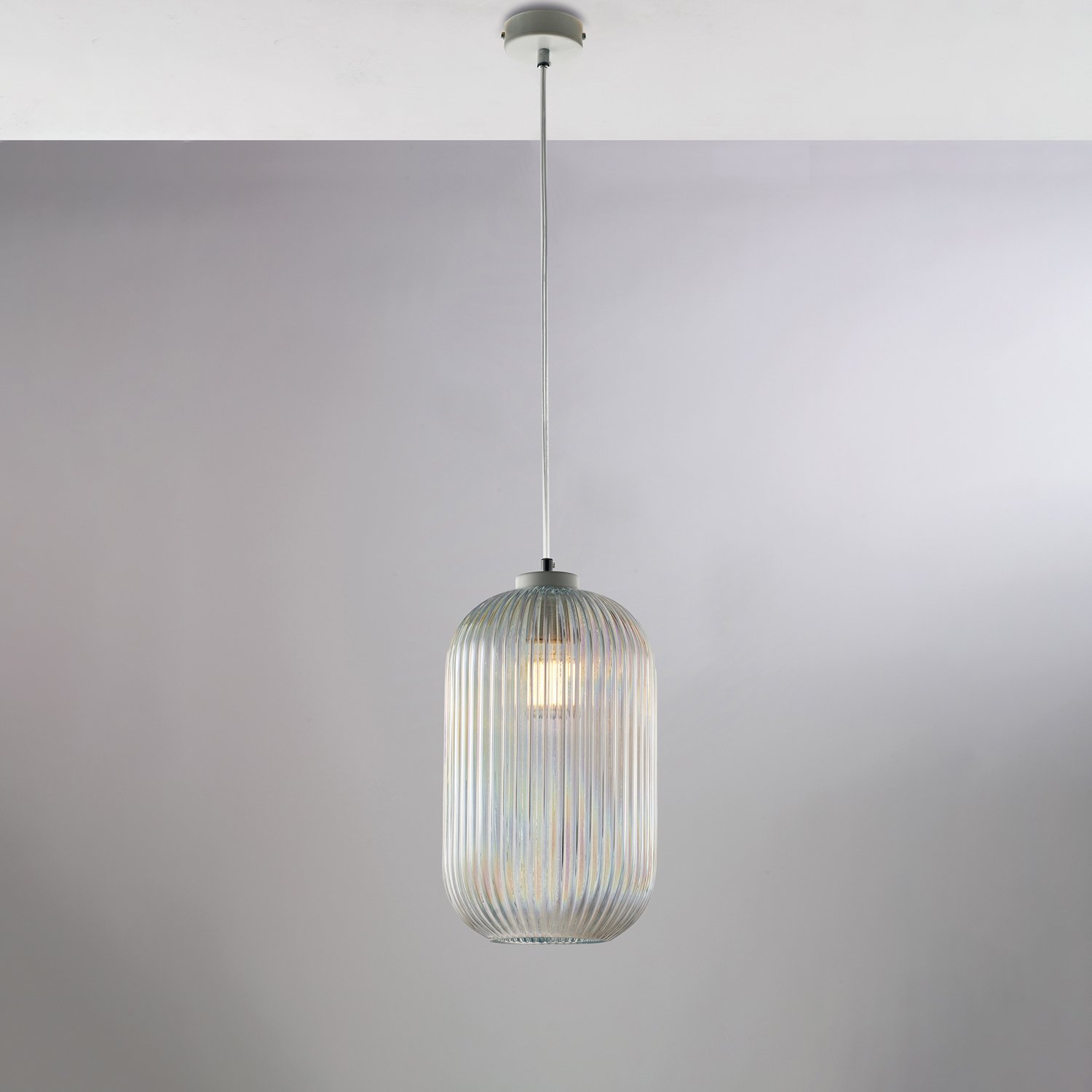 Sospensione a una luce in ferro laccato bianco con cavo elettrico regolabile. . Diffusore in vetro soffiato trasparente iridato con decoro rigatura in rilievo effetto plissè. Il vetro soffiato garantisce un'elevata qualità e una bellezza artigianale. La rigatura in rilievo con effetto plissé aggiunge texture e interesse visivo. Ogni pezzo è unico, grazie al processo di produzione manuale. Si adatta a una vasta gamma di stili di arredamento, dal moderno al classico, grazie al mix di materiali e finiture.