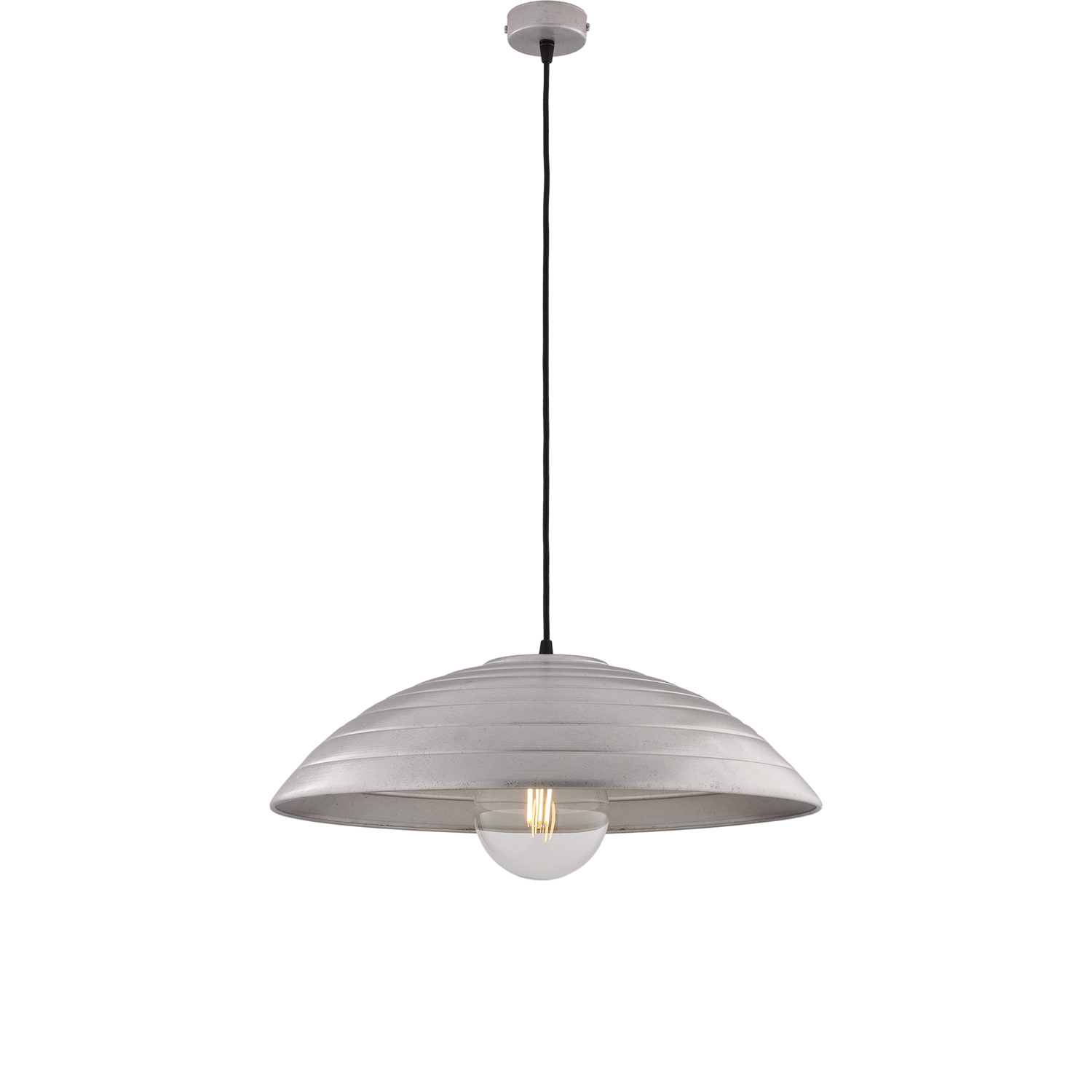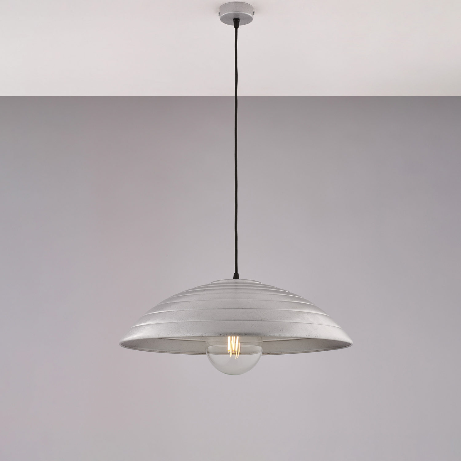 Sospensione a cupola con 1 luce in ferro laccato nero con decorazione argento antico e riagatura in rilievo. . Cavo elettrico regolabile ricoperto in tessuto nero. Costruita in ferro, garantisce robustezza e durata nel tempo. La finitura in argento antico aggiunge un aspetto vissuto e affascinante. Si integra perfettamente in contesti industrial chic, vintage, shabby chic o contemporanei che desiderano un accento classico. La forma a cupola permette di dirigere la luce verso il basso, ideale per illuminare aree specifiche come tavoli o isole della cucina.