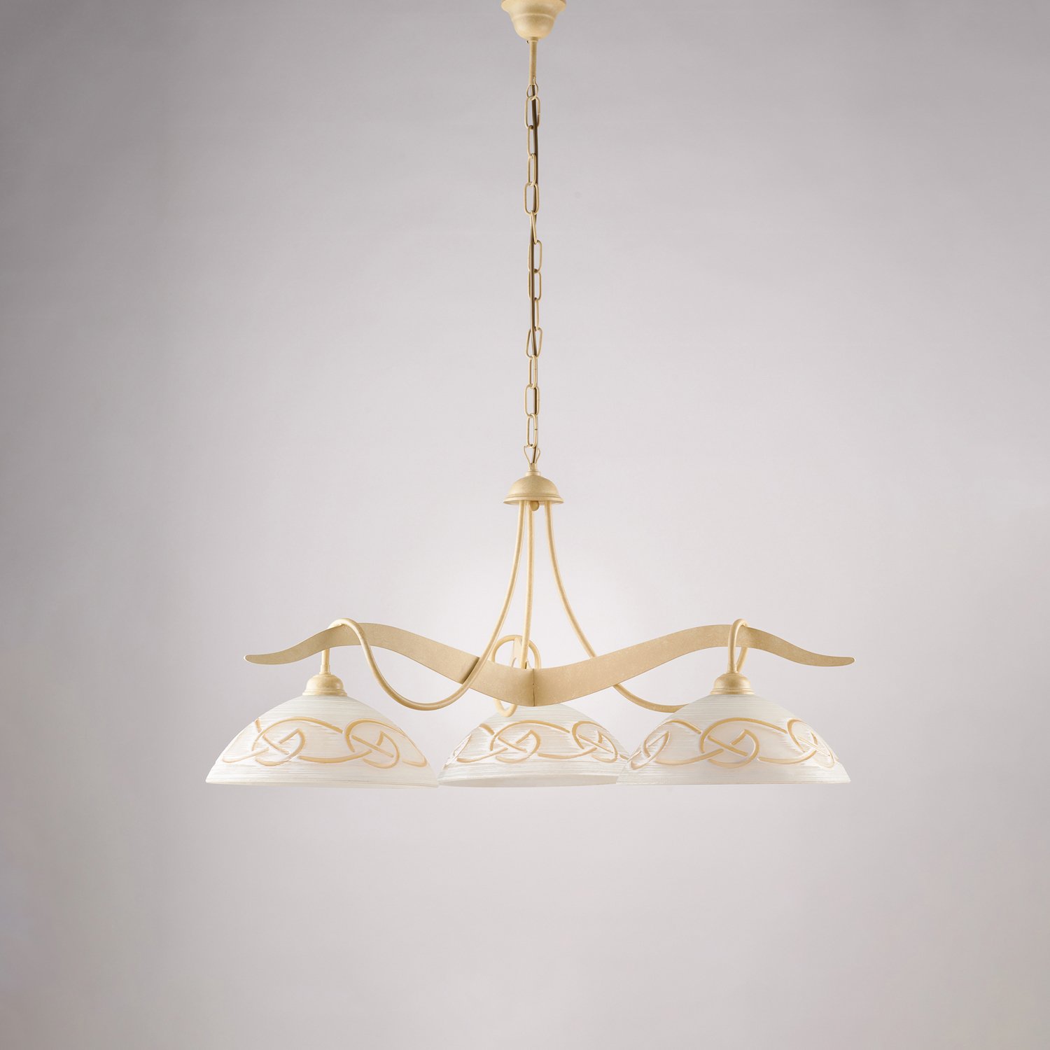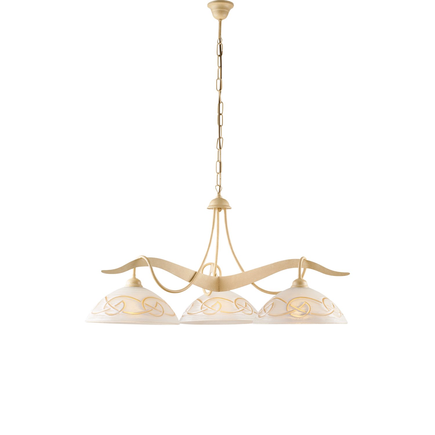 Collezione BilbaoPERFETTO STILE COUNTRYSospensione a 3 luci con struttura in ferro laccato avorio con decorazione effetto decapè. . I diffusori sono in vetro centrif..