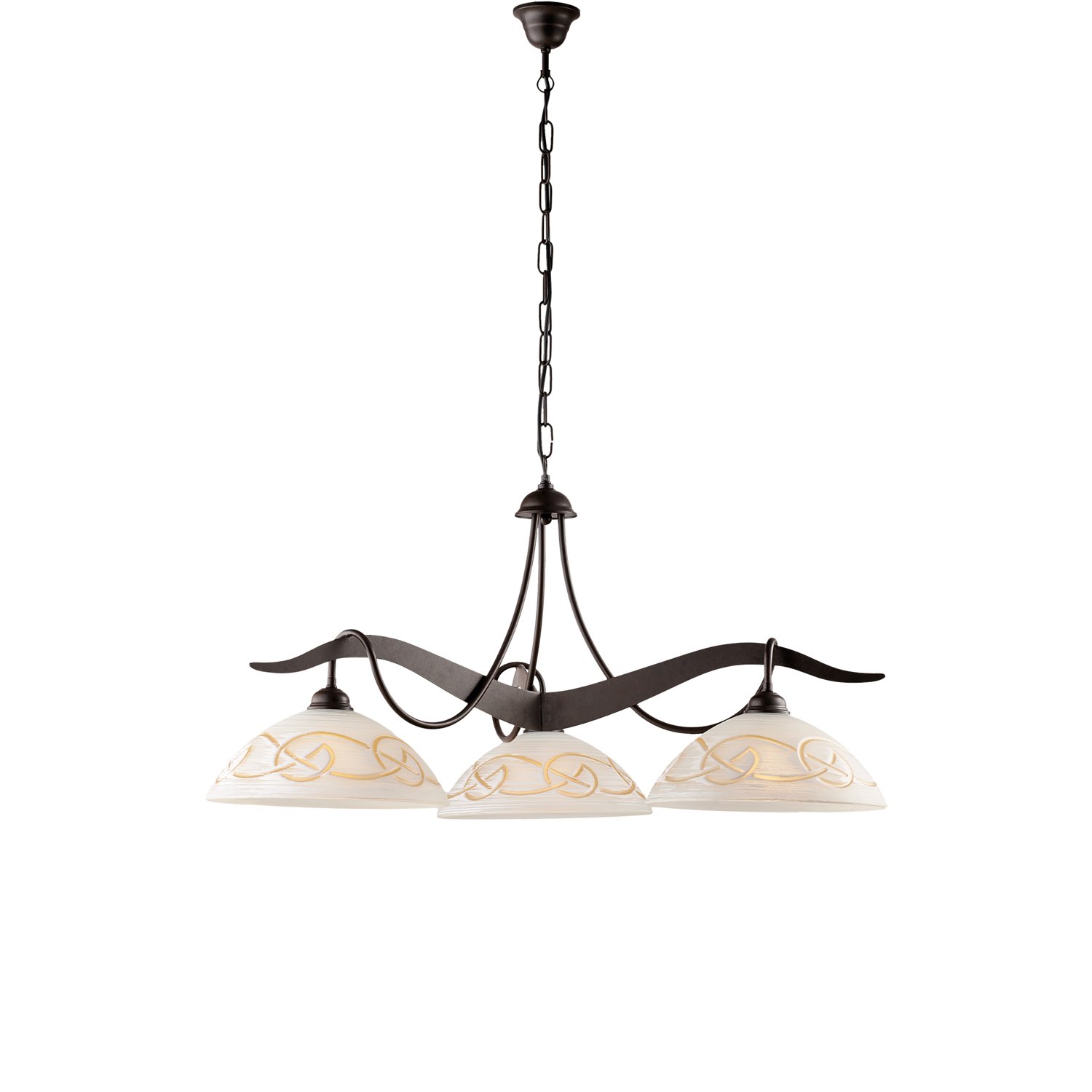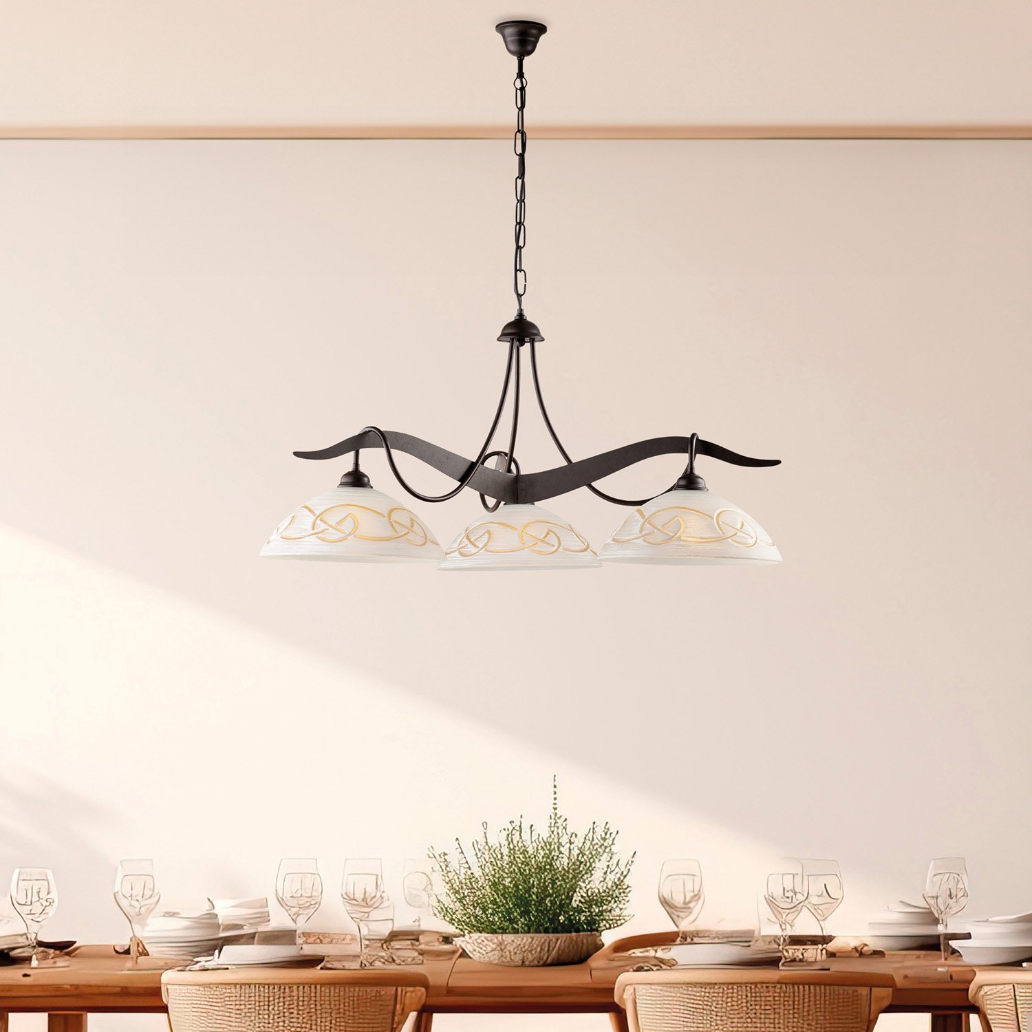 Sospensione a 3 luci con struttura in ferro laccato nero con decorazione effetto ruggine. . I diffusori sono in vetro centrifugato decorato a mano bianco e ambra. Il mix di materiali rustici e finiture eleganti conferisce a questa sospensione un fascino country chic che si adatta perfettamente a uno stile di arredamento rustico, ma con un tocco di raffinatezza. Unisce infatti robustezza e delicatezza in modo armonioso, creando un'atmosfera accogliente e affascinante. La combinazione di materiali e colori conferisce un tocco di carattere e autenticità, perfetto per arricchire e valorizzare gli spazi domestici con un'estetica rustica e ricercata.