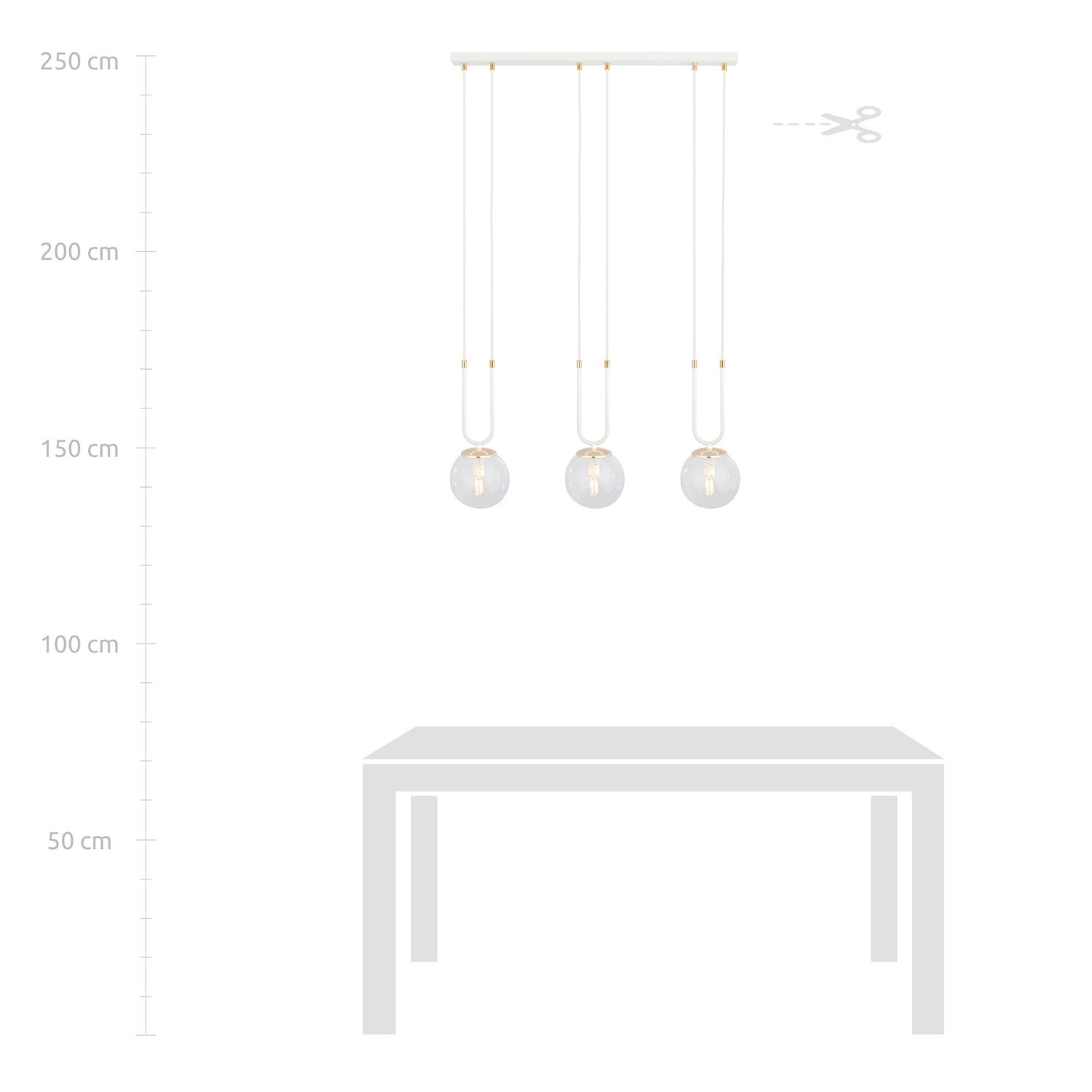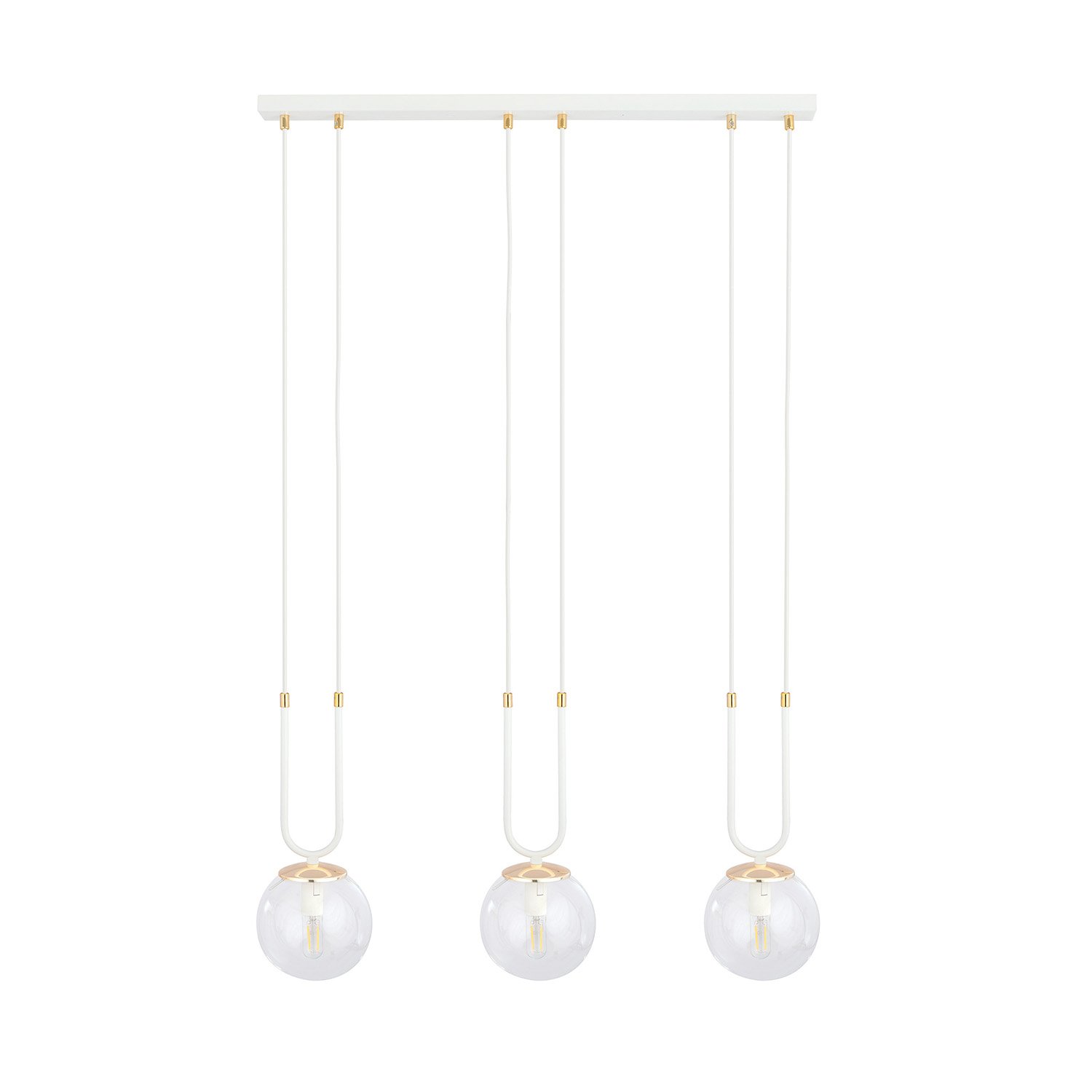Sospensione moderna realizzata con una base in metallo di colore bianco con dettagli decorativi in metallo color oro e 3 paralumi sferici in vetro trasparente. Aggiungono un'atmosfera straordinaria agli interni, presentandosi incredibilmente chic ed eleganti. Questa serie unica è progettata per gli appassionati di opulenza e bellezza. I paralumi in vetro donano alla serie GLAM un tocco di delicatezza e grazia, mentre gli elementi decorativi dorati la ravvivano e illuminano.