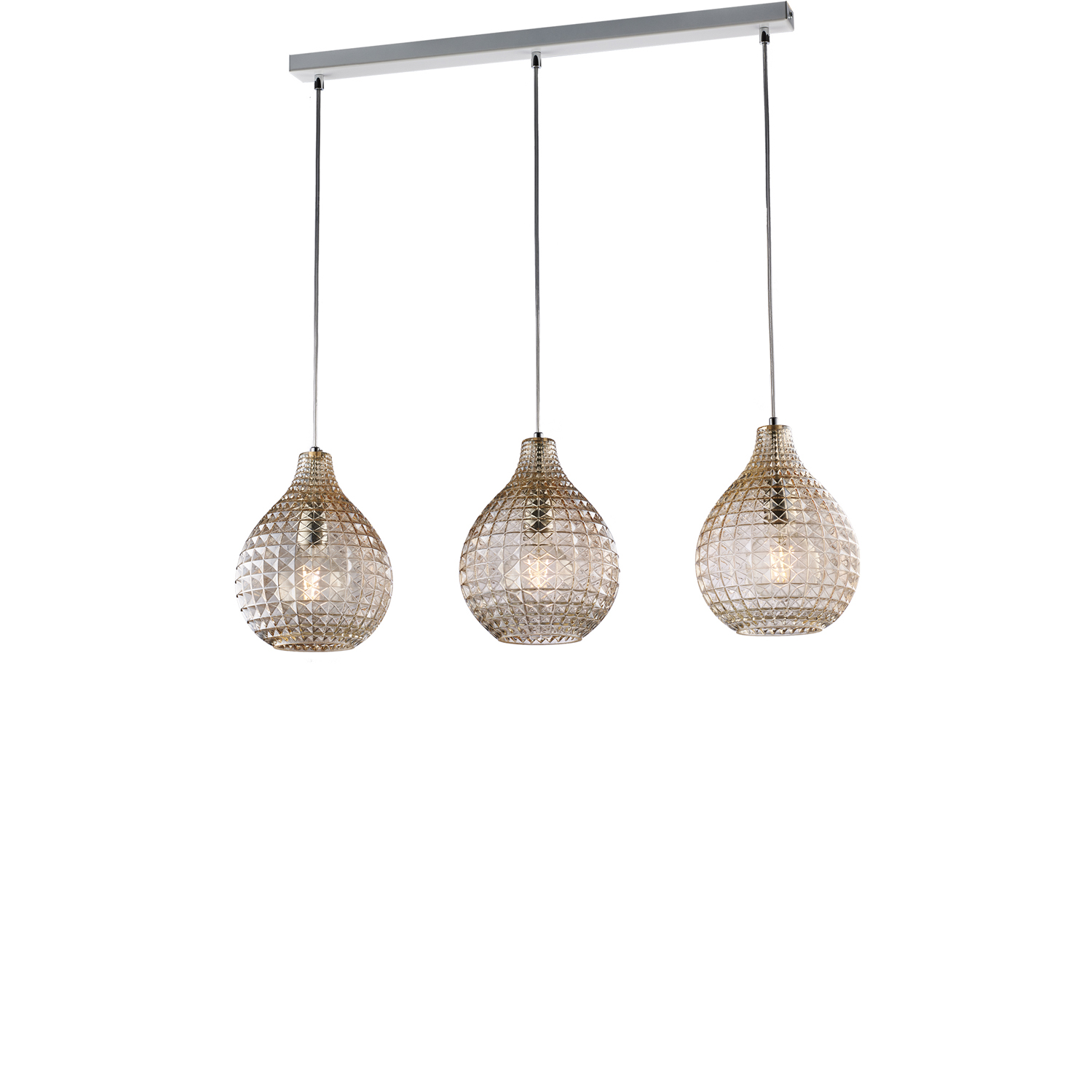 Collezione DiamanteELEGANTE E VERSATILESospensione a 3 luci con rosone in ferro laccato bianco e cavo elettrico regolabile.. Diffusori in vetro soffiato ambra con de..