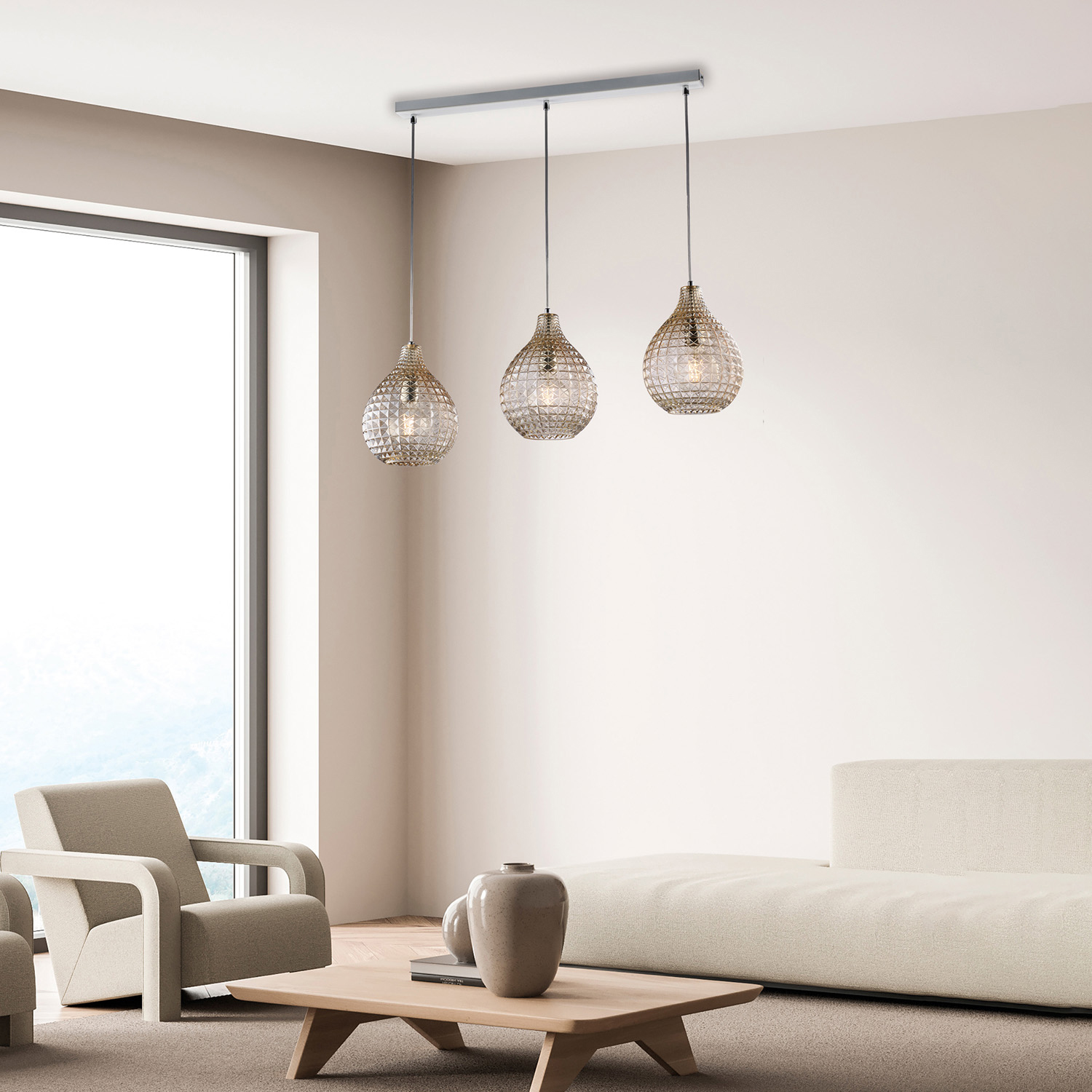 Sospensione a 3 luci con binario in ferro laccato bianco e cavo elettrico regolabile.. Diffusori in vetro soffiato ambra con decoro effetto cristallo. I diffusori in vetro soffiato sono un elemento distintivo che aggiunge un tocco di artigianalità e lusso. Il decoro effetto cristallo sul vetro soffiato crea un aspetto scintillante e riflettente, aggiungendo eleganza e migliorando la diffusione della luce. La possibilità di regolare l'altezza e il design elegante la rendono adatta a diversi ambienti e stili di arredamento, offrendo una combinazione di praticità ed estetica.