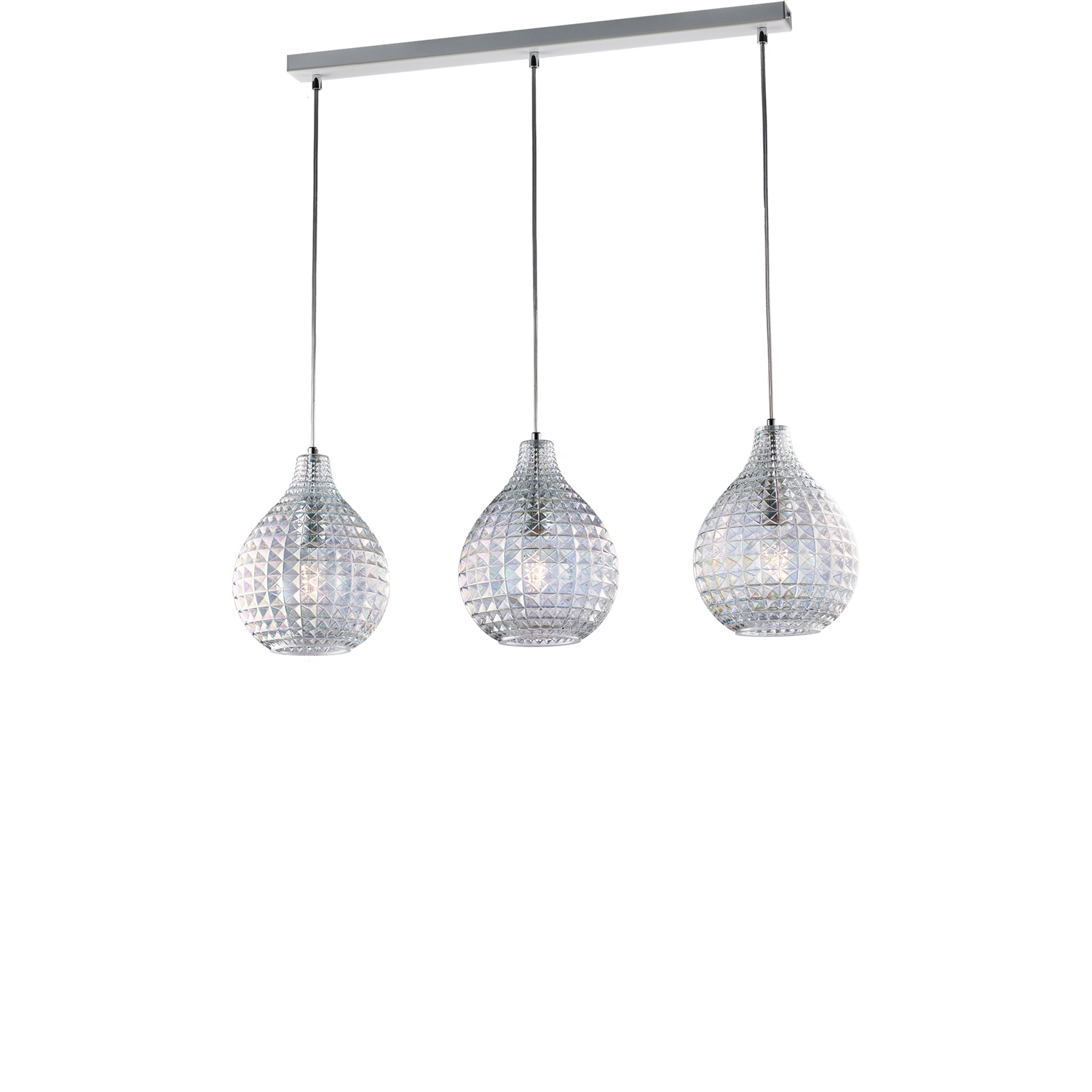 Sospensione a 3 luci con binario in ferro laccato bianco e cavo elettrico regolabile.. Diffusori in vetro soffiato trasparente iridato con decoro effetto cristallo. I diffusori in vetro sono un elemento distintivo che aggiunge un tocco di artigianalità e lusso. Il decoro effetto cristallo sul vetro soffiato crea un aspetto scintillante e riflettente, aggiungendo eleganza e migliorando la diffusione della luce. La possibilità di regolare l'altezza e il design elegante la rendono adatta a diversi ambienti e stili di arredamento, offrendo una combinazione di praticità ed estetica.