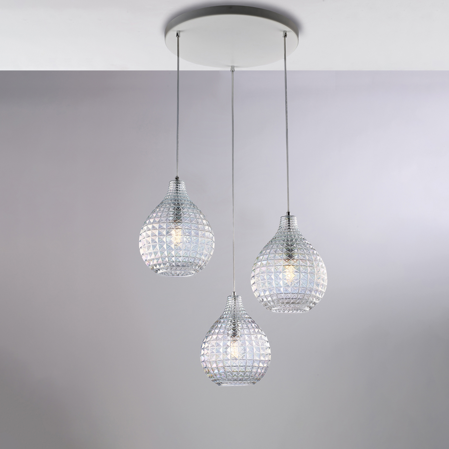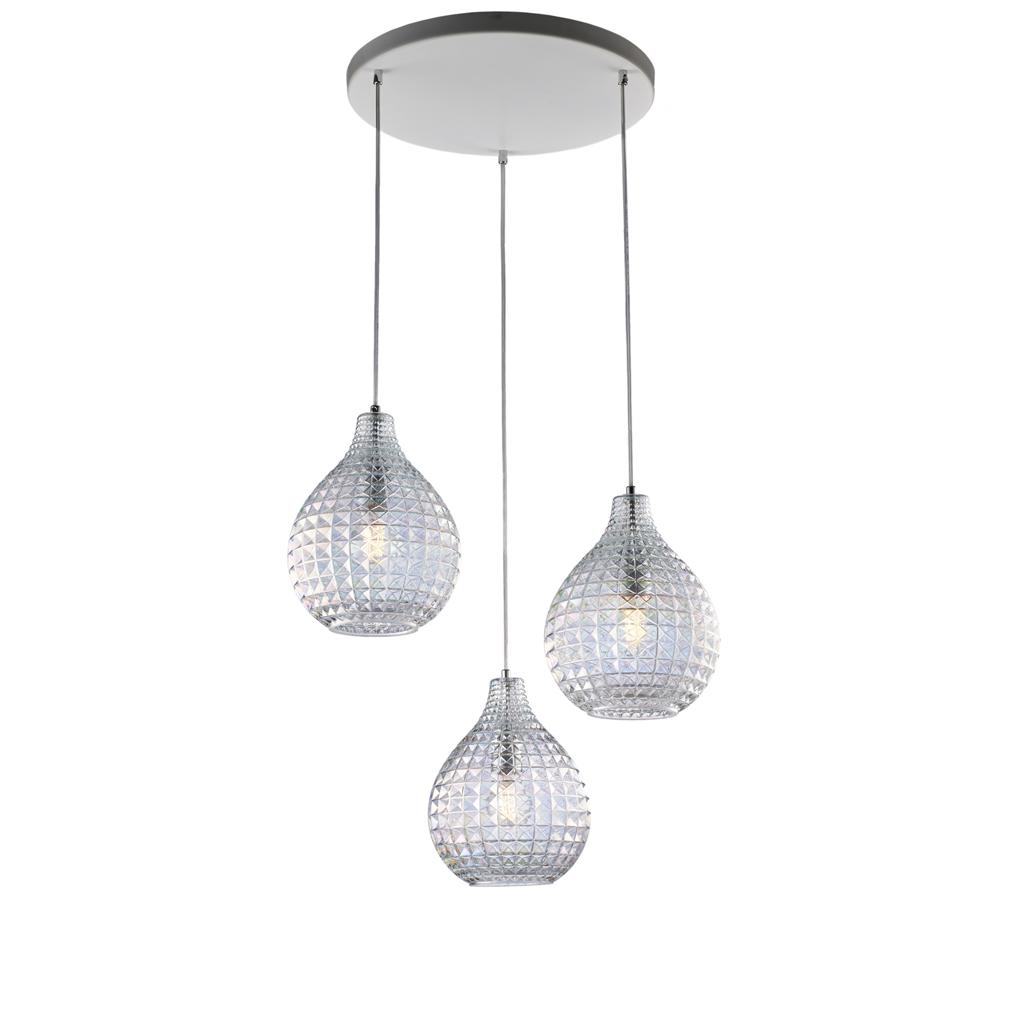 Collezione DiamanteELEGANTE E VERSATILESospensione a 3 luci con rosone in ferro laccato bianco e cavo elettrico regolabile.. Diffusori in vetro soffiato trasparente ..