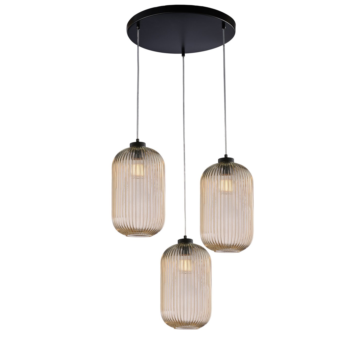 Sospensione a tre luci in ferro laccato nero con cavo elettrico regolabile. Diffusori in vetro soffiato ambra con decoro rigatura in rilievo effetto plissè.. Diffusori in vetro soffiato ambra con decoro rigatura in rilievo effetto plissè. Il vetro soffiato è un materiale che garantisce un'elevata qualità e una bellezza artigianale. La rigatura in rilievo con effetto plissé aggiunge texture e interesse visivo. Ogni pezzo è unico, grazie al processo di produzione manuale. Si adatta a una vasta gamma di stili di arredamento, dal moderno al classico, grazie al mix di materiali e finiture. Ideale sopra il tavolo da pranzo per creare un punto focale elegante e illuminare le cene conviviali.