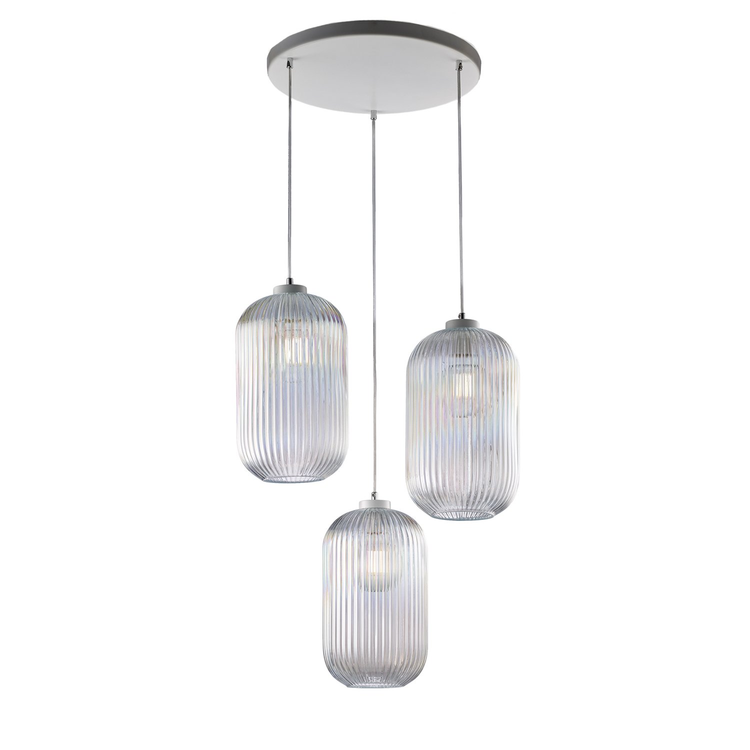Sospensione a tre luci in ferro laccato bianco con cavo elettrico regolabile. . Diffusori in vetro soffiato trasparente iridato con decoro rigatura in rilievo effetto plissè. Il vetro soffiato è un materiale che garantisce un'elevata qualità e una bellezza artigianale. La rigatura in rilievo con effetto plissé aggiunge texture e interesse visivo. Ogni pezzo è unico, grazie al processo di produzione manuale. Si adatta a una vasta gamma di stili di arredamento, dal moderno al classico, grazie al mix di materiali e finiture. Ideale sopra il tavolo da pranzo per creare un punto focale elegante e illuminare le cene conviviali.