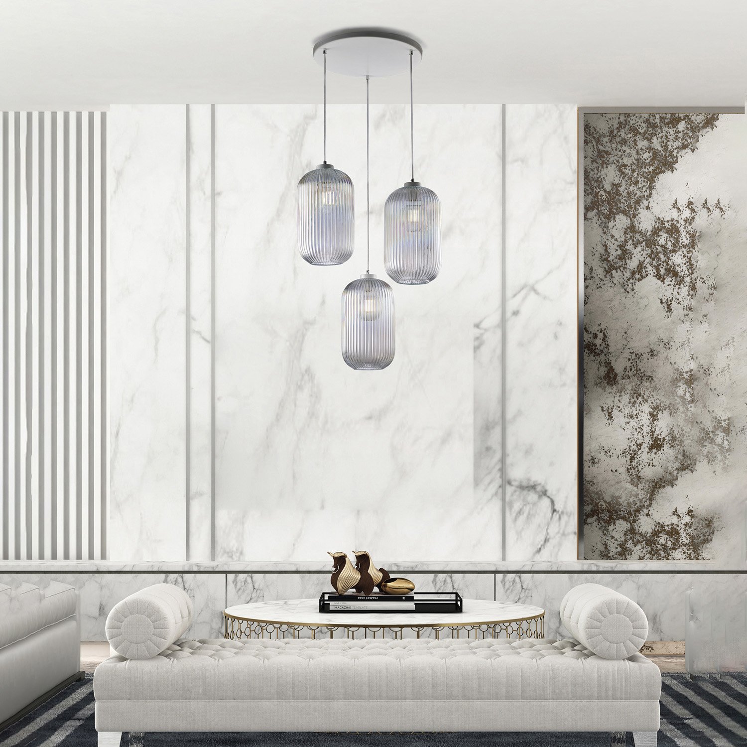 Sospensione 3 Luci Krizia In Ferro Nero Vetro Grigio Specchiato Effetto Plisse'