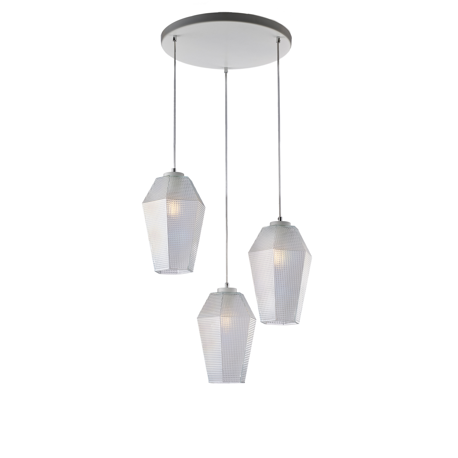 Sospensione a 3 luci con rosone in ferro laccato bianco, cavo elettrico regolabile e diffusori in vetro trasparente iridato con forma esagonale.. Il vetro presenta decorazioni in rilievo che aggiungono texture e profondità, creando un effetto visivo interessante sia con la luce accesa che spenta. Soluzione perfetta per creare atmosfere accoglienti e sofisticate.