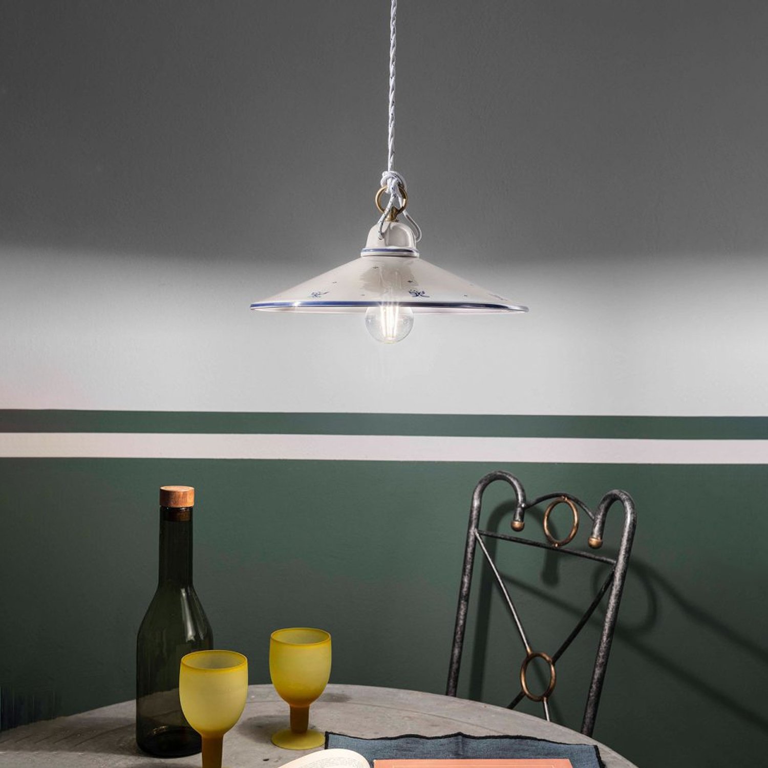 Collezione ASTIL'ARMONIA DEI DECORISospensione in ceramica decoro filo blu con montatura ottone satinato frutto di una lavorazione eseguita rigorosamente a mano.. La..