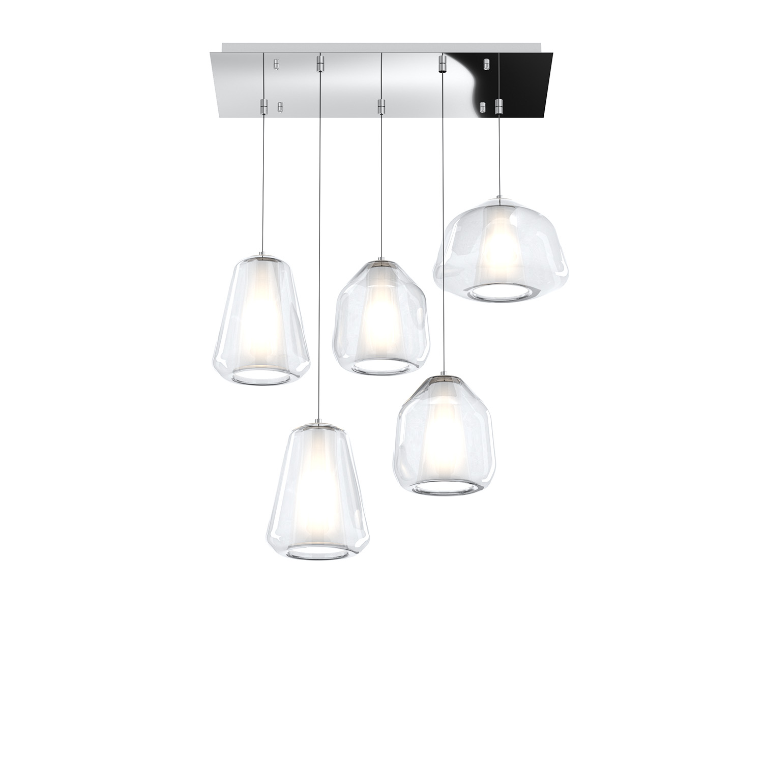 Collezione DOUBLE SKINLAMPADA DALLA DOPPIA ANIMASospensione 5 luci composta da una struttura in metallo color cromo, un rosone rettangolare e 5 diffusori in vetro pi..