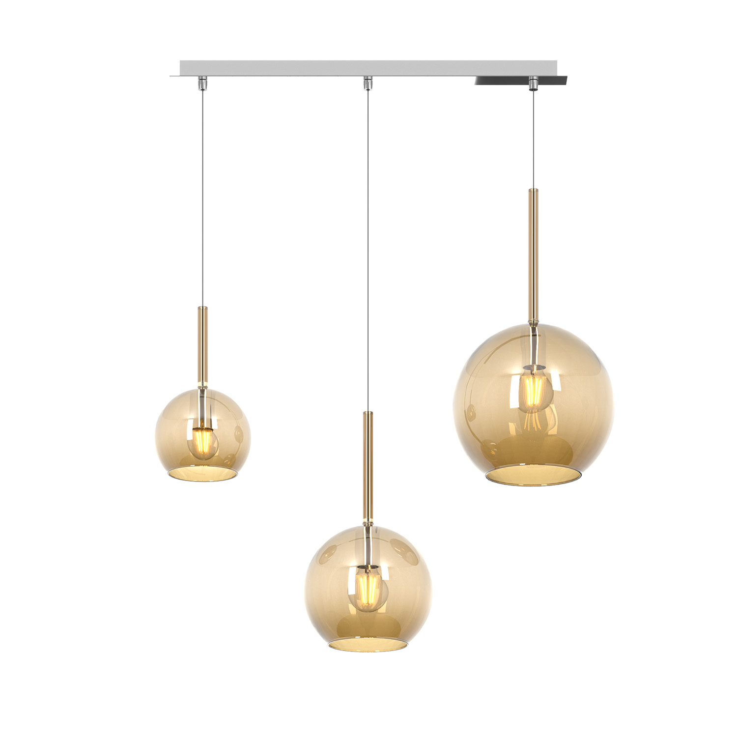 Sospensione 3 luci dal rosone lineare e rettangolare con struttura in metallo finitura cromo e da 3 vetri tutti differenti nelle dimensioni colore ambra.. Le finiture dei vetri cromo, rame, oro e ambra sono trattamenti superficiali che riducono solo parzialmente l'emissione luminosa. La finitura trasparente può essere naturalmente abbinata alle altre. Le strutture in metallo sono disponibili nelle finiture cromo, bianco e ottone satinato, con il diffusore in vetro disponibile in tutte le finiture esistenti.Possibilità di creare una composizione componibile in base ai componenti della sospensione scelti.Questo articolo è disponibile in diverse finiture e/o dimensioni. E' possibile indicarlo nell'apposito campo NOTE presente in conclusione di ordine oppure contattarci dopo aver effettuato l'ordine.