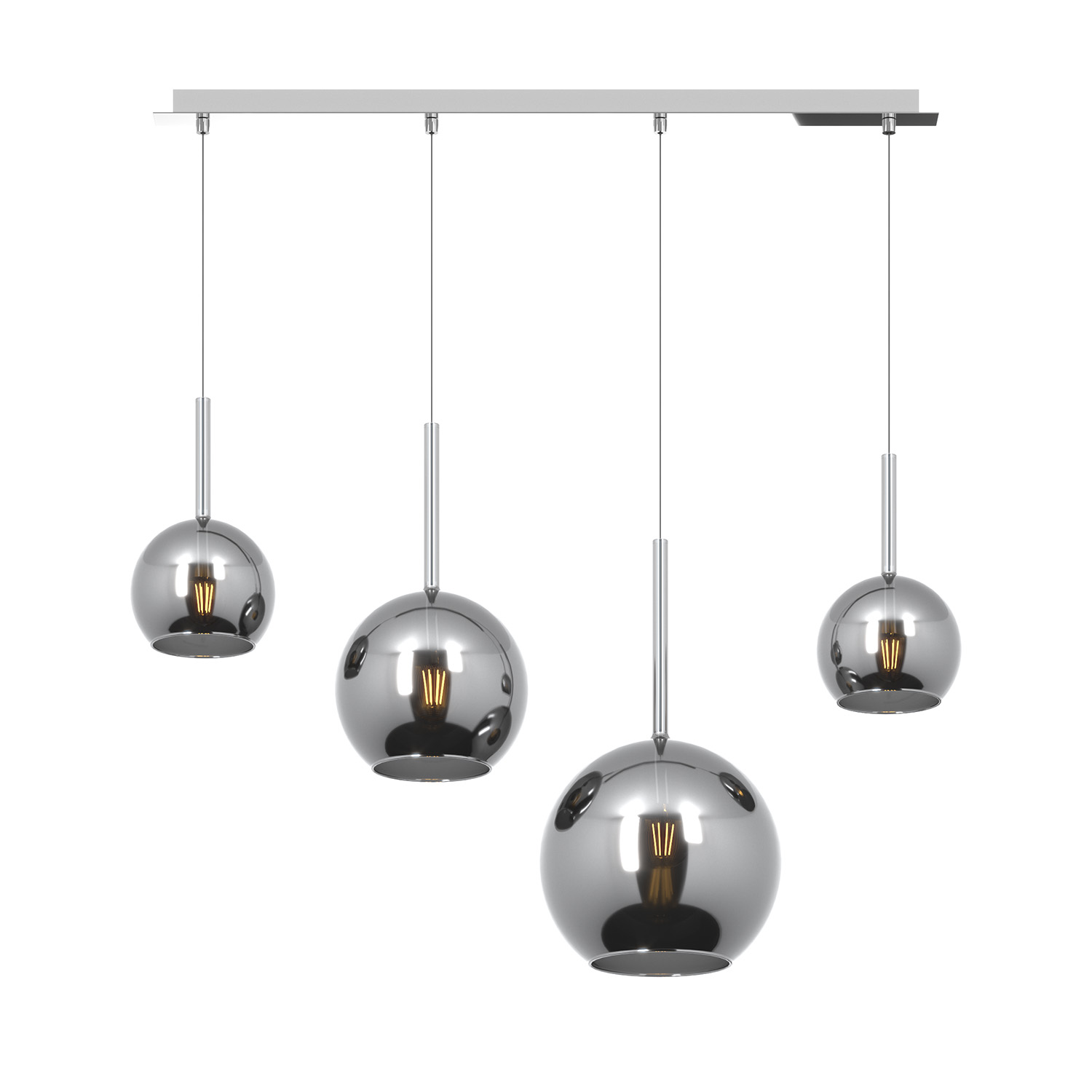 Sospensione 4 luci dal rosone rettangolare con struttura in metallo finitura cromo e da 4 vetri tutti differenti nelle dimensioni colore cromo.. Le finiture dei vetri cromo, rame, oro e ambra sono trattamenti superficiali che riducono solo parzialmente l'emissione luminosa. La finitura trasparente può essere naturalmente abbinata alle altre. Le strutture in metallo sono disponibili nelle finiture cromo, bianco e ottone satinato, con il diffusore in vetro disponibile in tutte le finiture esistenti.Possibilità di creare una composizione componibile in base ai componenti della sospensione scelti.Questo articolo è disponibile in diverse finiture e/o dimensioni. E' possibile indicarlo nell'apposito campo NOTE presente in conclusione di ordine oppure contattarci dopo aver effettuato l'ordine.
