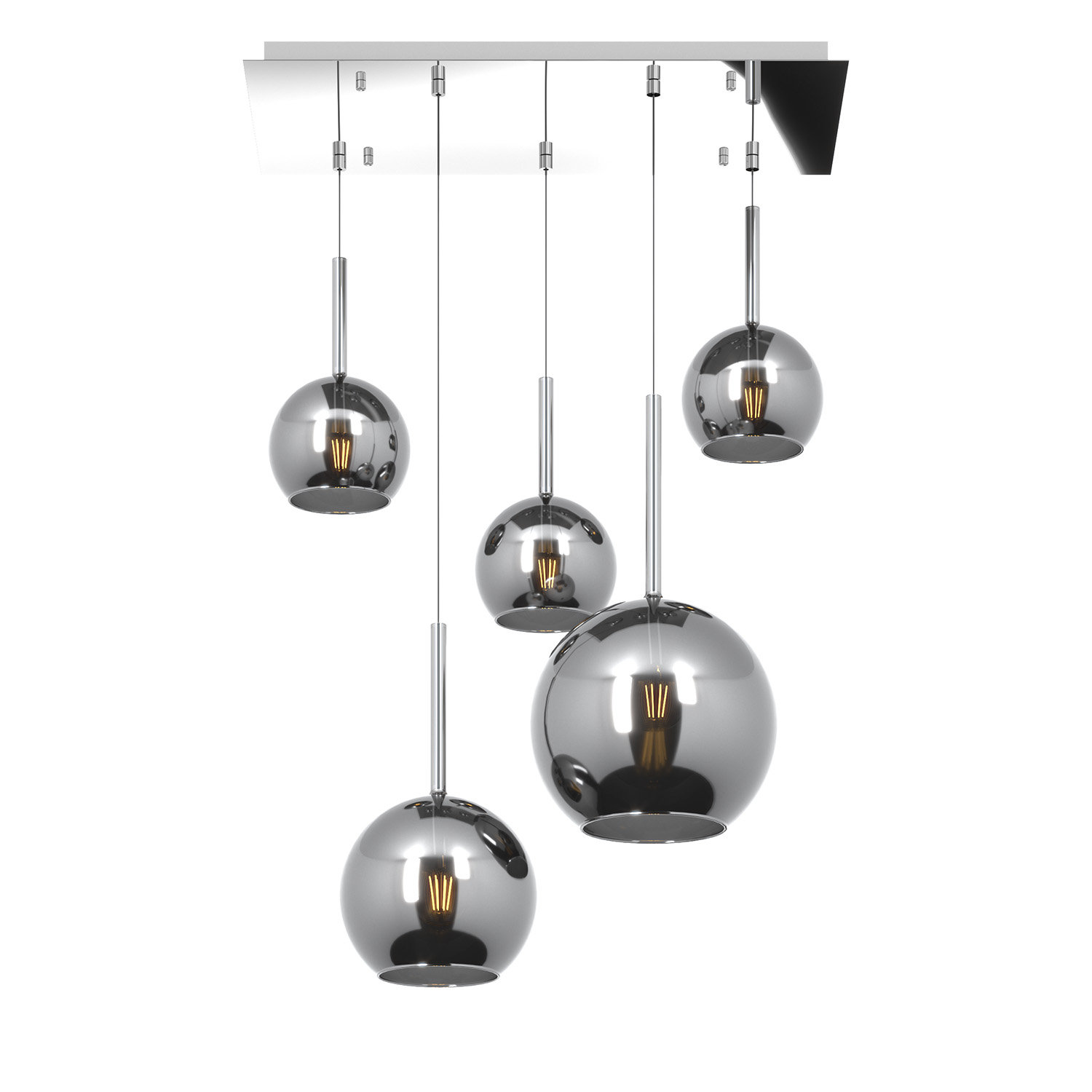Sospensione 5 luci dal rosone rettangolare con struttura in metallo finitura cromo e da 5 vetri tutti differenti nelle dimensioni colore cromo.. Le finiture dei vetri cromo, rame, oro e ambra sono trattamenti superficiali che riducono solo parzialmente l'emissione luminosa. La finitura trasparente può essere naturalmente abbinata alle altre. Le strutture in metallo sono disponibili nelle finiture cromo, bianco e ottone satinato, con il diffusore in vetro disponibile in tutte le finiture esistenti.Possibilità di creare una composizione componibile in base ai componenti della sospensione scelti.Questo articolo è disponibile in diverse finiture e/o dimensioni. E' possibile indicarlo nell'apposito campo NOTE presente in conclusione di ordine oppure contattarci dopo aver effettuato l'ordine.