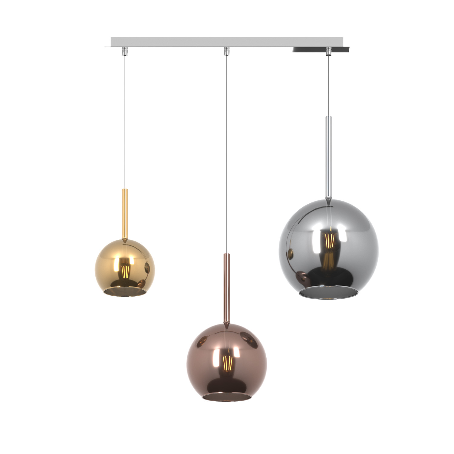 Sospensione 3 luci dal rosone rettangolare con struttura in metallo finitura cromo e da 3 vetri tutti differenti nelle dimensioni colore multicolor.. Le finiture dei vetri cromo, rame, oro e ambra sono trattamenti superficiali che riducono solo parzialmente l'emissione luminosa. La finitura trasparente può essere naturalmente abbinata alle altre. Le strutture in metallo sono disponibili nelle finiture cromo, bianco e ottone satinato, con il diffusore in vetro disponibile in tutte le finiture esistenti. Possibilità di creare una composizione componibile in base ai componenti della sospensione scelti.Questo articolo è disponibile in diverse finiture e/o dimensioni. E' possibile indicarlo nell'apposito campo NOTE presente in conclusione di ordine oppure contattarci dopo aver effettuato l'ordine.