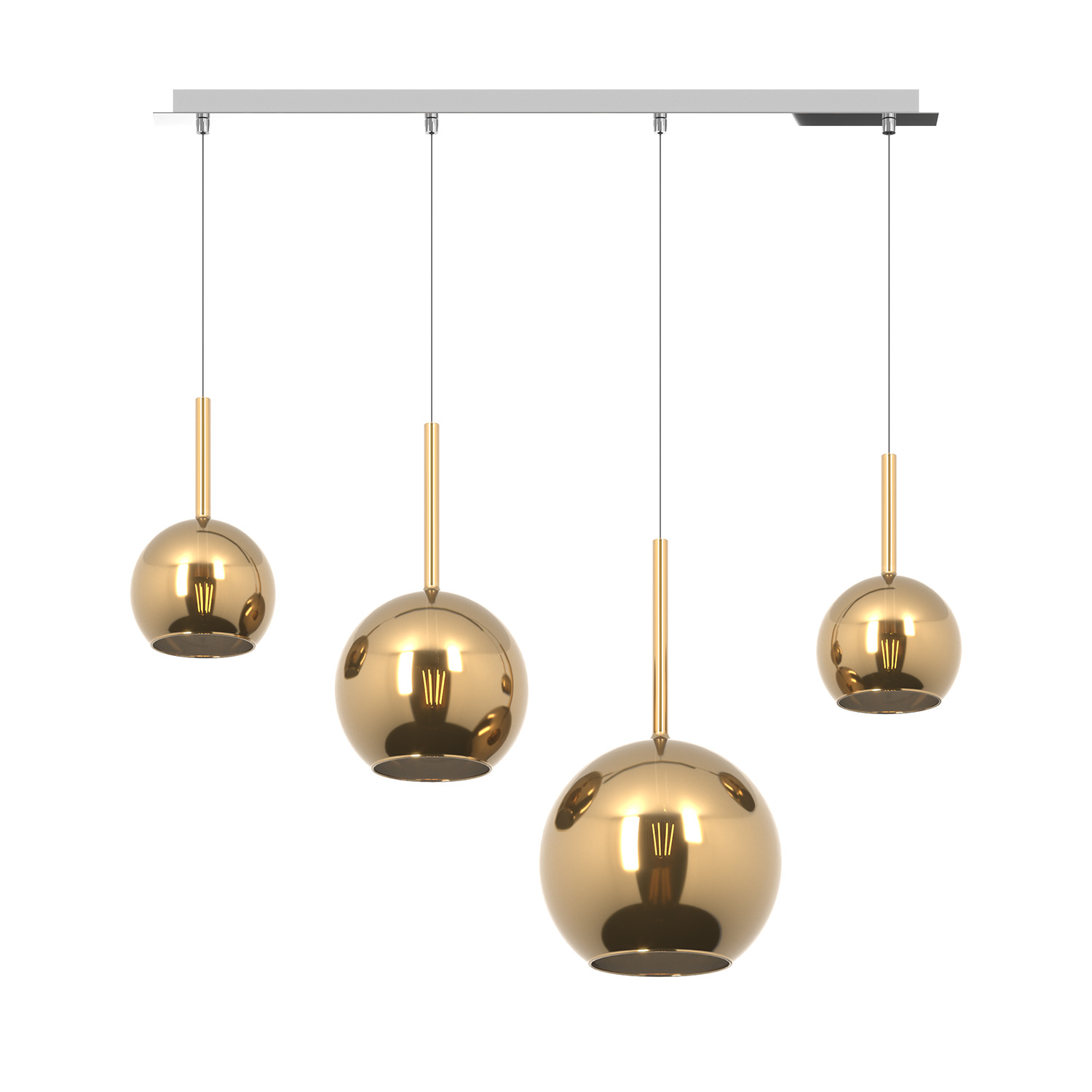 Sospensione 4 luci dal rosone rettangolare con struttura in metallo finitura cromo e da 4 vetri tutti differenti nelle dimensioni colore oro.. Le finiture dei vetri cromo, rame, oro e ambra sono trattamenti superficiali che riducono solo parzialmente l'emissione luminosa. La finitura trasparente può essere naturalmente abbinata alle altre. Le strutture in metallo sono disponibili nelle finiture cromo, bianco e ottone satinato, con il diffusore in vetro disponibile in tutte le finiture esistenti.Possibilità di creare una composizione componibile in base ai componenti della sospensione scelti.Questo articolo è disponibile in diverse finiture e/o dimensioni. E' possibile indicarlo nell'apposito campo NOTE presente in conclusione di ordine oppure contattarci dopo aver effettuato l'ordine.