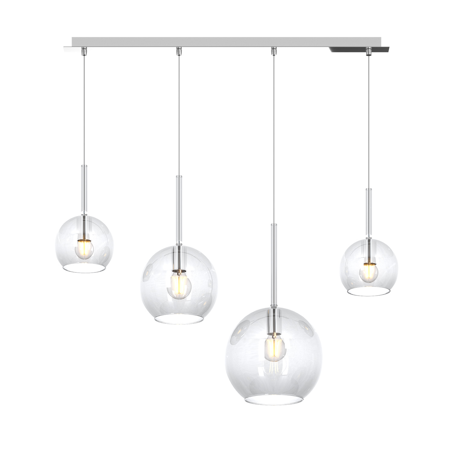 Sospensione 4 luci dal rosone rettangolare con struttura in metallo finitura cromo e da 4 vetri tutti differenti nelle dimensioni colore trasparente.. Le finiture dei vetri cromo, rame, oro e ambra sono trattamenti superficiali che riducono solo parzialmente l'emissione luminosa. La finitura trasparente può essere naturalmente abbinata alle altre. Le strutture in metallo sono disponibili nelle finiture cromo, bianco e ottone satinato, con il diffusore in vetro disponibile in tutte le finiture esistenti.Possibilità di creare una composizione componibile in base ai componenti della sospensione scelti.Questo articolo è disponibile in diverse finiture e/o dimensioni. E' possibile indicarlo nell'apposito campo NOTE presente in conclusione di ordine oppure contattarci dopo aver effettuato l'ordine.
