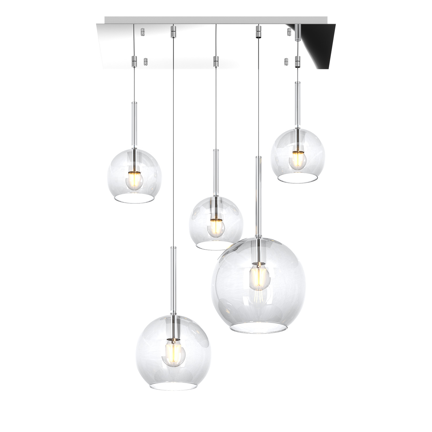 Sospensione 5 luci dal rosone rettangolare con struttura in metallo finitura cromo e da 5 vetri tutti differenti nelle dimensioni colore trasparente.. Le finiture dei vetri cromo, rame, oro e ambra sono trattamenti superficiali che riducono solo parzialmente l'emissione luminosa. La finitura trasparente può essere naturalmente abbinata alle altre. Le strutture in metallo sono disponibili nelle finiture cromo, bianco e ottone satinato, con il diffusore in vetro disponibile in tutte le finiture esistenti.Possibilità di creare una composizione componibile in base ai componenti della sospensione scelti.Questo articolo è disponibile in diverse finiture e/o dimensioni. E' possibile indicarlo nell'apposito campo NOTE presente in conclusione di ordine oppure contattarci dopo aver effettuato l'ordine.