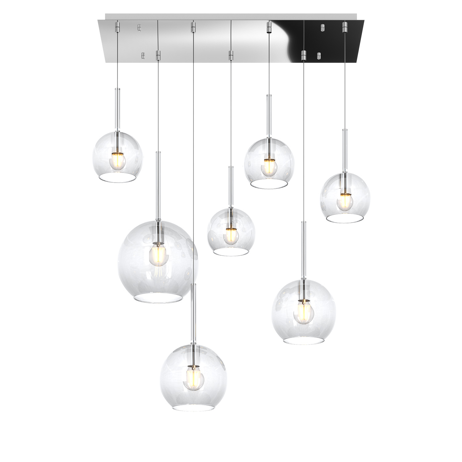 Sospensione 7 luci dal rosone rettangolare con struttura in metallo finitura cromo e da 7 vetri tutti differenti nelle dimensioni colore trasparente.. Le finiture dei vetri cromo, rame, oro e ambra sono trattamenti superficiali che riducono solo parzialmente l'emissione luminosa. La finitura trasparente può essere naturalmente abbinata alle altre. Le strutture in metallo sono disponibili nelle finiture cromo, bianco e ottone satinato, con il diffusore in vetro disponibile in tutte le finiture esistenti. Possibilità di creare una composizione componibile in base ai componenti della sospensione scelti.Questo articolo è disponibile in diverse finiture e/o dimensioni. E' possibile indicarlo nell'apposito campo NOTE presente in conclusione di ordine oppure contattarci dopo aver effettuato l'ordine.