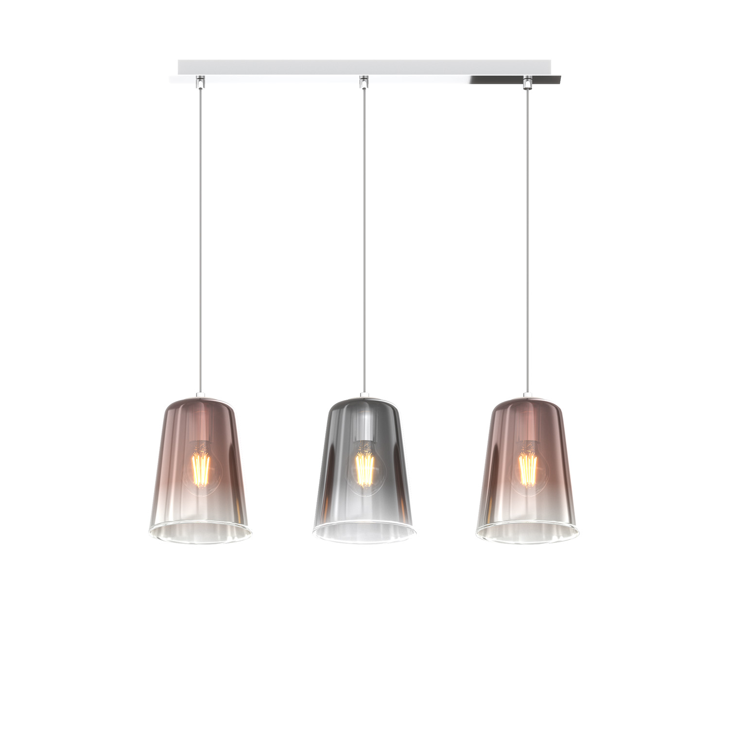 Sospensione 3 luci con struttura in metallo cromo e rosone rettangolare e con 3 coni in vetro pirex soffiato colore rame e cromo.. Le finiture dei vetri cromo, rame e ambra sono trattamenti superficiali sfumati verso il basso. Le strutture in metallo sono disponibili nelle finiture cromo, bianco e ottone satinato. La serie viene completata da una lampada da appoggioQuesto articolo è disponibile in diverse finiture e/o dimensioni. E' possibile indicarlo nell'apposito campo NOTE presente in conclusione di ordine oppure contattarci dopo aver effettuato l'ordine.