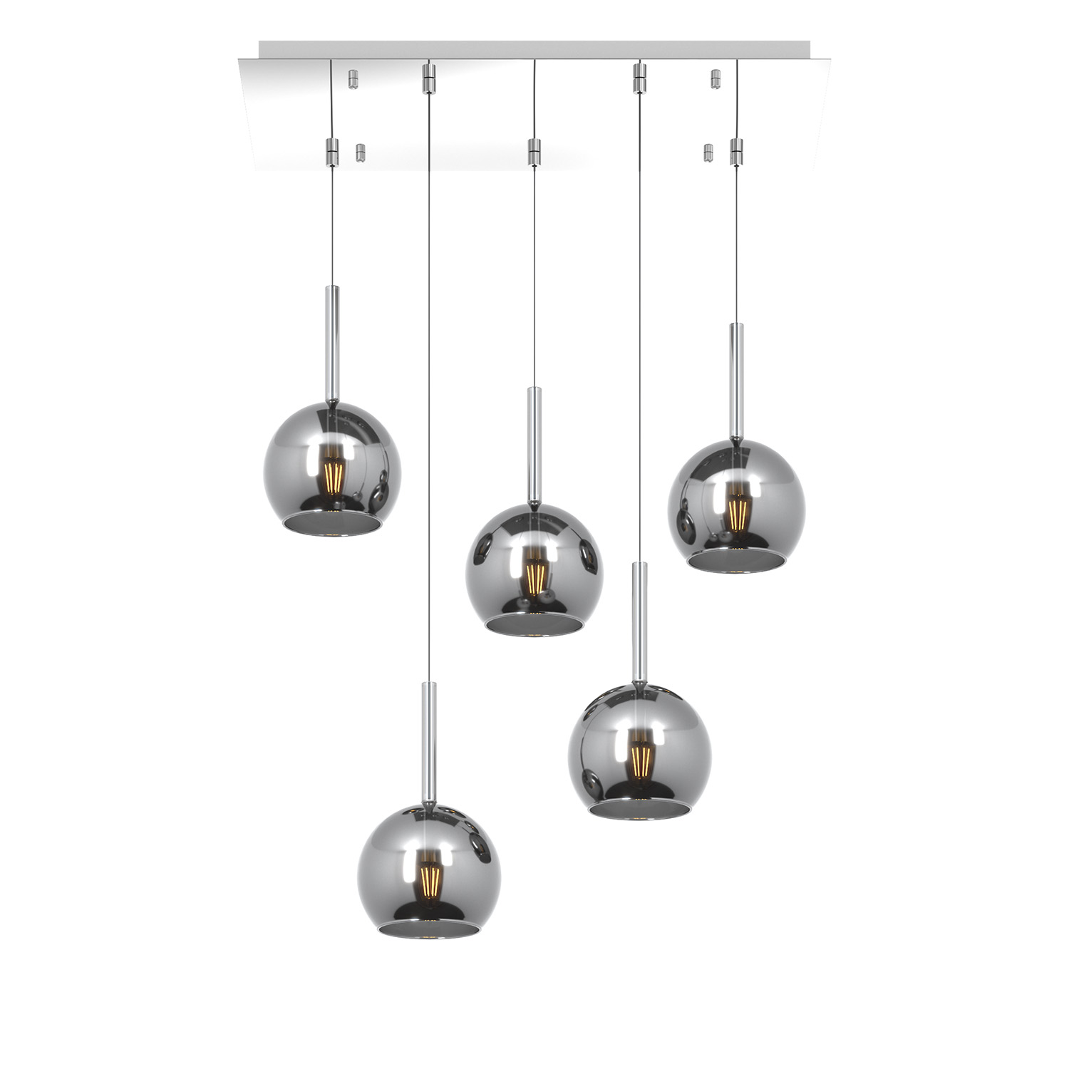 Sospensione 5 luci dal rosone rettangolare con struttura in metallo finitura cromo e da 5 vetri di uguale dimensione colore cromo.. Le finiture dei vetri cromo, rame, oro e ambra sono trattamenti superficiali che riducono solo parzialmente l'emissione luminosa. La finitura trasparente può essere naturalmente abbinata alle altre. Le strutture in metallo sono disponibili nelle finiture cromo, bianco e ottone satinato, con il diffusore in vetro disponibile in tutte le finiture esistenti.Possibilità di creare una composizione componibile in base ai componenti della sospensione scelti.Questo articolo è disponibile in diverse finiture e/o dimensioni. E' possibile indicarlo nell'apposito campo NOTE presente in conclusione di ordine oppure contattarci dopo aver effettuato l'ordine.
