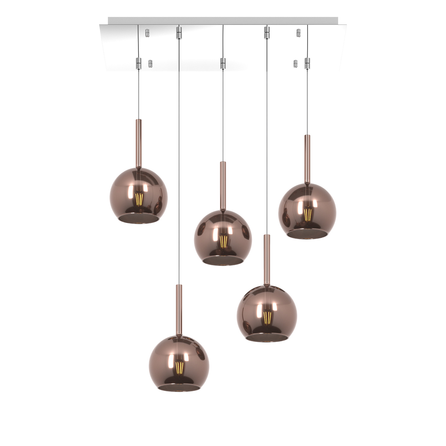 Sospensione 5 luci dal rosone rettangolare con struttura in metallo finitura cromo e da 5 vetri di uguale dimensione colore rame.. Le finiture dei vetri cromo, rame, oro e ambra sono trattamenti superficiali che riducono solo parzialmente l'emissione luminosa. La finitura trasparente può essere naturalmente abbinata alle altre. Le strutture in metallo sono disponibili nelle finiture cromo, bianco e ottone satinato, con il diffusore in vetro disponibile in tutte le finiture esistenti.Possibilità di creare una composizione componibile in base ai componenti della sospensione scelti.Questo articolo è disponibile in diverse finiture e/o dimensioni. E' possibile indicarlo nell'apposito campo NOTE presente in conclusione di ordine oppure contattarci dopo aver effettuato l'ordine.
