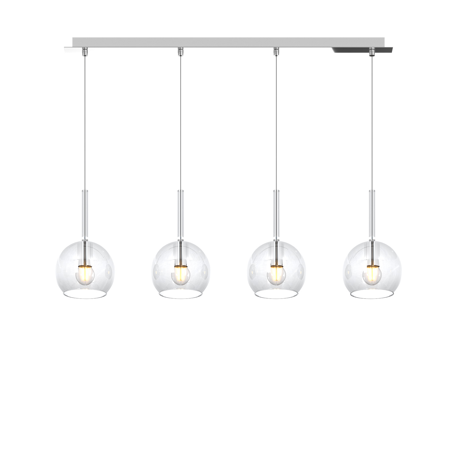 Sospensione 4 luci dal rosone rettangolare con struttura in metallo finitura cromo e da 4 vetri di uguale dimensione colore trasparente.. Le finiture dei vetri cromo, rame, oro e ambra sono trattamenti superficiali che riducono solo parzialmente l'emissione luminosa. La finitura trasparente può essere naturalmente abbinata alle altre. Le strutture in metallo sono disponibili nelle finiture cromo, bianco e ottone satinato, con il diffusore in vetro disponibile in tutte le finiture esistenti.Possibilità di creare una composizione componibile in base ai componenti della sospensione scelti.Questo articolo è disponibile in diverse finiture e/o dimensioni. E' possibile indicarlo nell'apposito campo NOTE presente in conclusione di ordine oppure contattarci dopo aver effettuato l'ordine.
