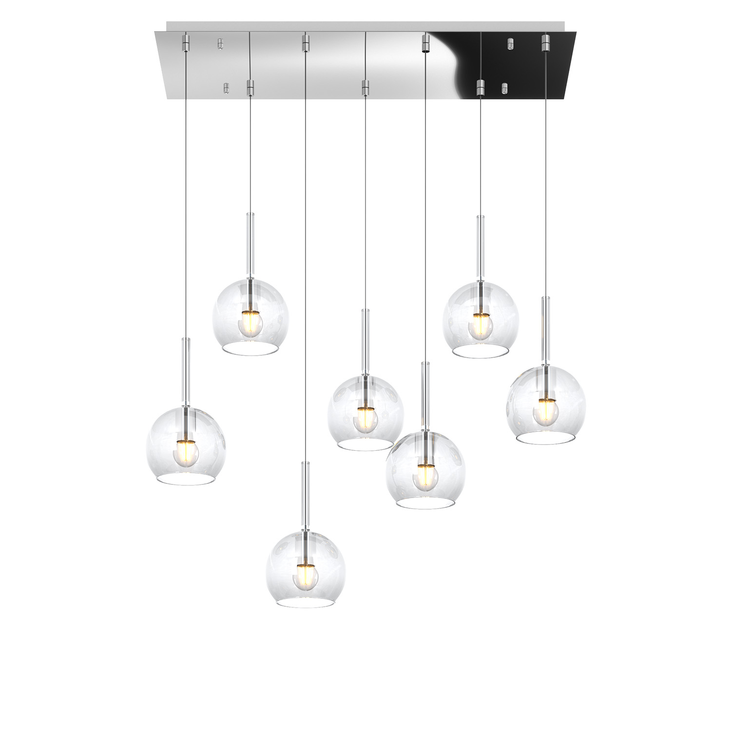 Sospensione 7 luci dal rosone rettangolare con struttura in metallo finitura cromo e da 7 vetri di uguale dimensione colore trasparente.. Le finiture dei vetri cromo, rame, oro e ambra sono trattamenti superficiali che riducono solo parzialmente l'emissione luminosa. La finitura trasparente può essere naturalmente abbinata alle altre. Le strutture in metallo sono disponibili nelle finiture cromo, bianco e ottone satinato, con il diffusore in vetro disponibile in tutte le finiture esistenti.Possibilità di creare una composizione componibile in base ai componenti della sospensione scelti.Questo articolo è disponibile in diverse finiture e/o dimensioni. E' possibile indicarlo nell'apposito campo NOTE presente in conclusione di ordine oppure contattarci dopo aver effettuato l'ordine.