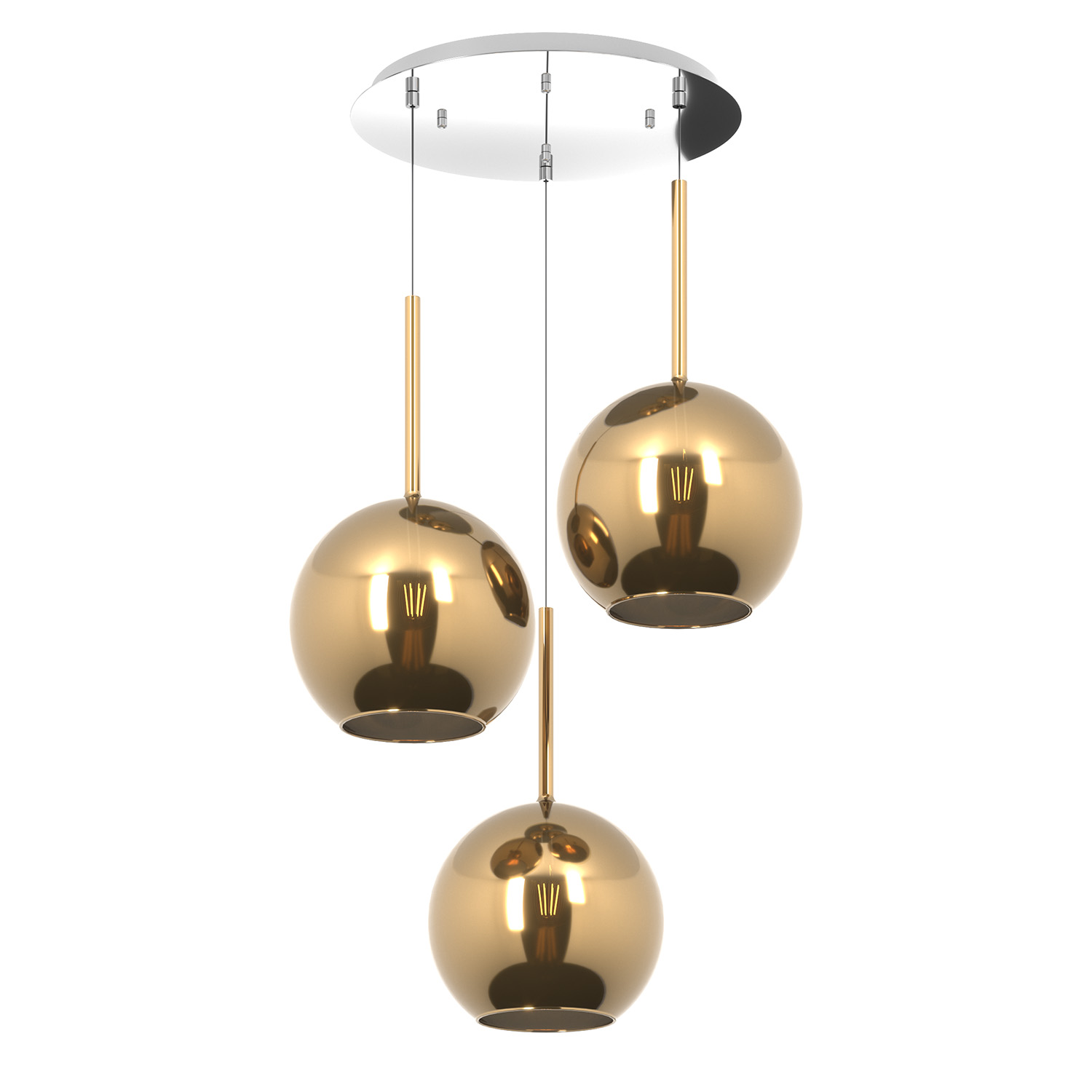 Sospensione 3 luci dal rosone tondo con struttura in metallo finitura cromo e da 3 vetri grandi di uguale dimensione colore oro.. Le finiture dei vetri cromo, rame, oro e ambra sono trattamenti superficiali che riducono solo parzialmente l'emissione luminosa. La finitura trasparente può essere naturalmente abbinata alle altre. Le strutture in metallo sono disponibili nelle finiture cromo, bianco e ottone satinato, con il diffusore in vetro disponibile in tutte le finiture esistenti.Possibilità di creare una composizione componibile in base ai componenti della sospensione scelti.Questo articolo è disponibile in diverse finiture e/o dimensioni. E' possibile indicarlo nell'apposito campo NOTE presente in conclusione di ordine oppure contattarci dopo aver effettuato l'ordine.
