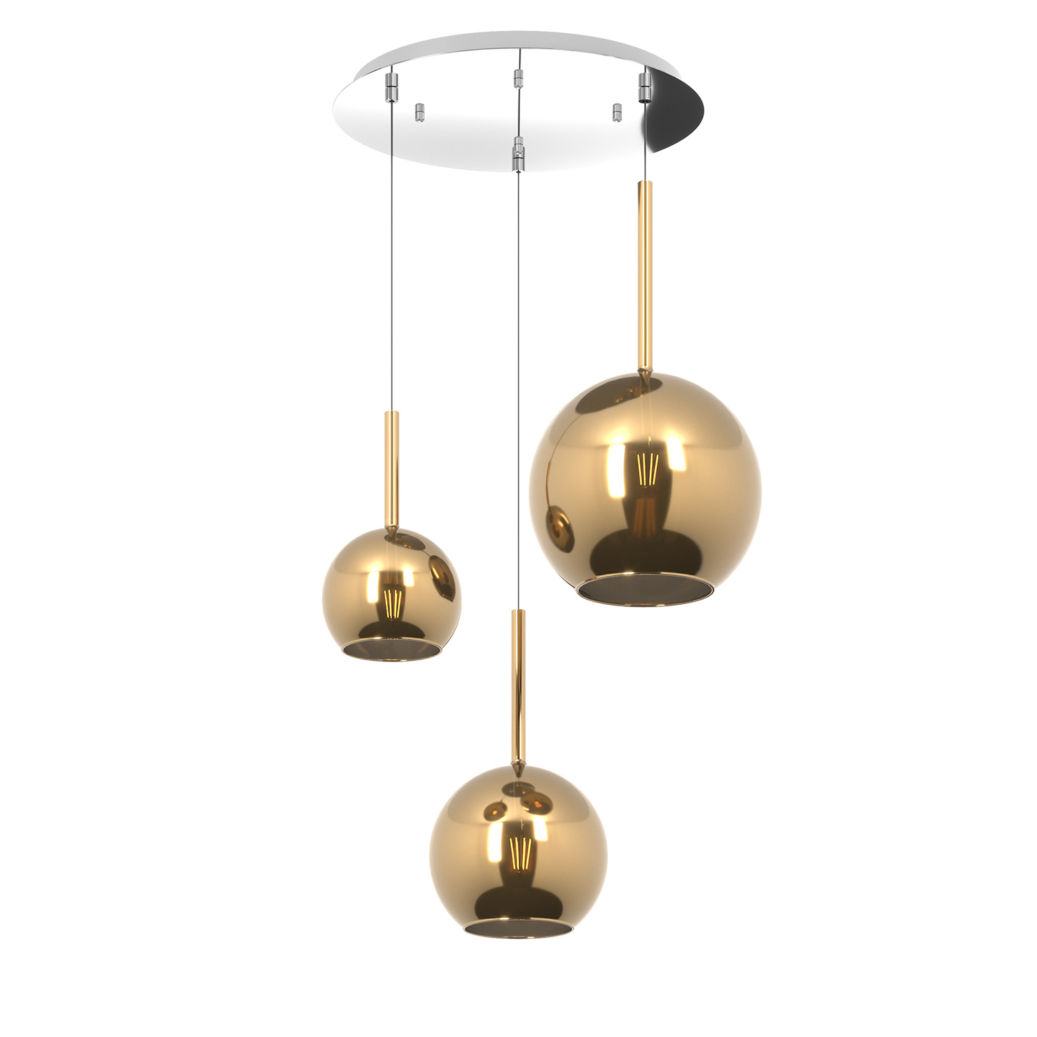 Sospensione 3 luci dal rosone tondo con struttura in metallo finitura cromo e da 3 vetri tutti differenti nelle dimensioni colore oro.. Le finiture dei vetri cromo, rame, oro e ambra sono trattamenti superficiali che riducono solo parzialmente l'emissione luminosa. La finitura trasparente può essere naturalmente abbinata alle altre. Le strutture in metallo sono disponibili nelle finiture cromo, bianco e ottone satinato, con il diffusore in vetro disponibile in tutte le finiture esistenti.Possibilità di creare una composizione componibile in base ai componenti della sospensione scelti.Questo articolo è disponibile in diverse finiture e/o dimensioni. E' possibile indicarlo nell'apposito campo NOTE presente in conclusione di ordine oppure contattarci dopo aver effettuato l'ordine.