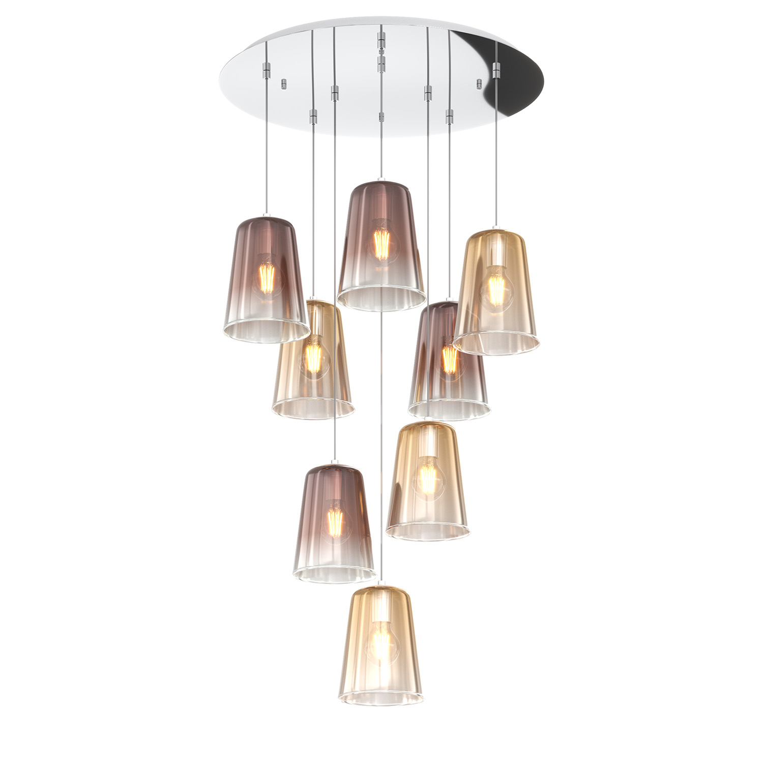 Sospensione 8 luci struttura in metallo cromo e rosone tondo e con 8 coni in vetro pirex soffiato colore ambra e rame posti in altezza differente tra di loro.. Le finiture dei vetri cromo, rame e ambra sono trattamenti superficiali sfumati verso il basso. Le strutture in metallo sono disponibili nelle finiture cromo, bianco e ottone satinato. La serie viene completata da una lampada da appoggioQuesto articolo è disponibile in diverse finiture e/o dimensioni. E' possibile indicarlo nell'apposito campo NOTE presente in conclusione di ordine oppure contattarci dopo aver effettuato l'ordine.