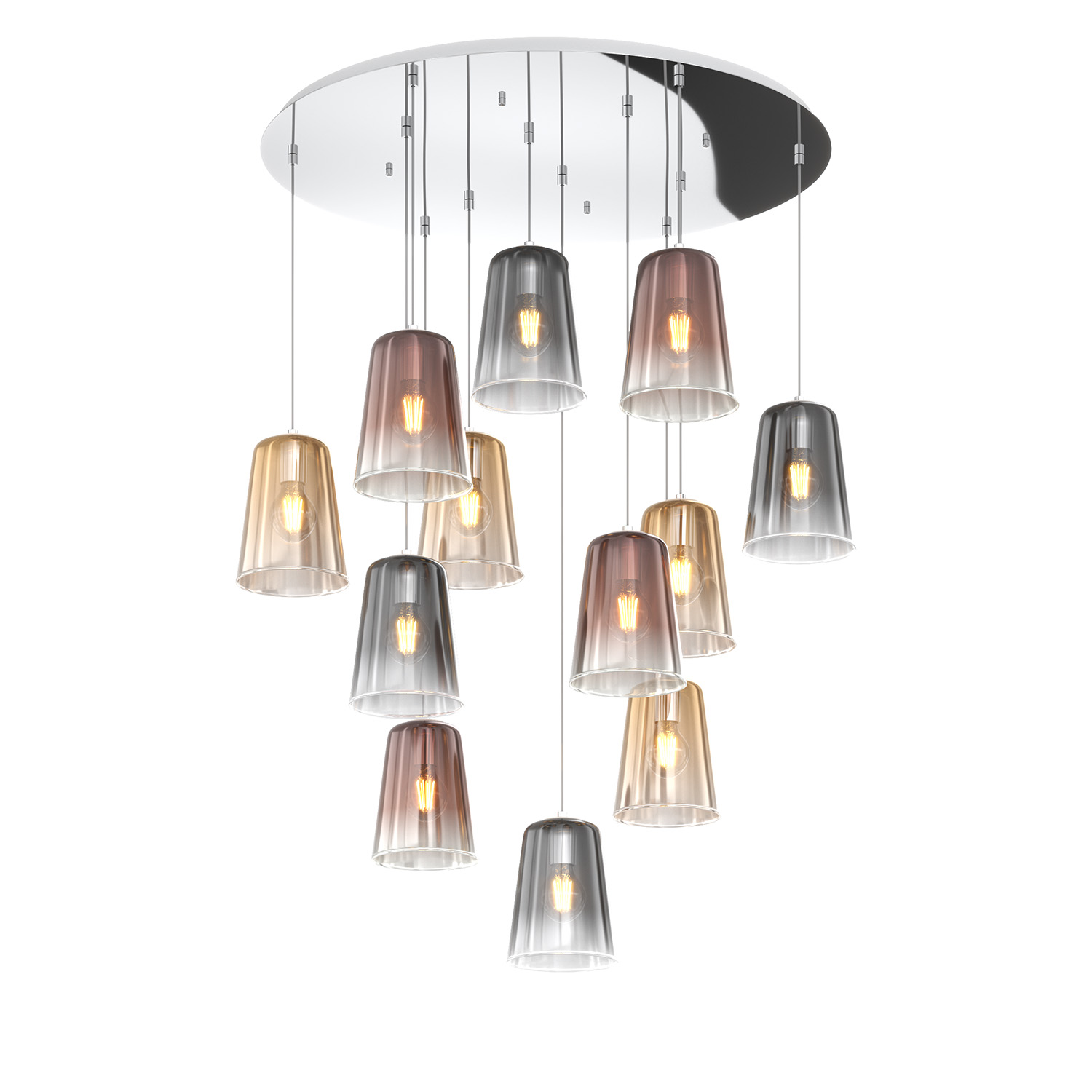 Sospensione 12 luci struttura in metallo cromo e rosone tondo e con 12 coni in vetro pirex soffiato multicolor posti in altezza differente tra di loro.. Le finiture dei vetri cromo, rame e ambra sono trattamenti superficiali sfumati verso il basso. Le strutture in metallo sono disponibili nelle finiture cromo, bianco e ottone satinato. La serie viene completata da una lampada da appoggioQuesto articolo è disponibile in diverse finiture e/o dimensioni. E' possibile indicarlo nell'apposito campo NOTE presente in conclusione di ordine oppure contattarci dopo aver effettuato l'ordine.