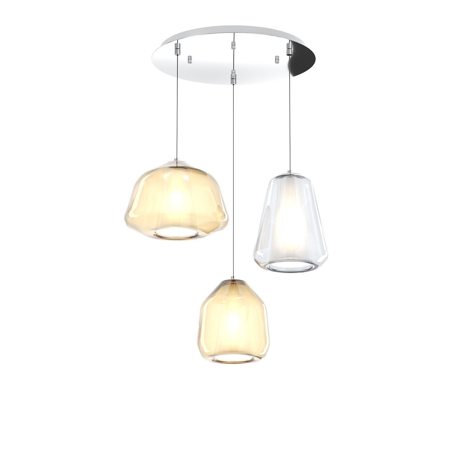 Sospensione Contemp Tonda Double Skin Metallo Cromo Vetro Mix Trasp Ambra 3 Luci