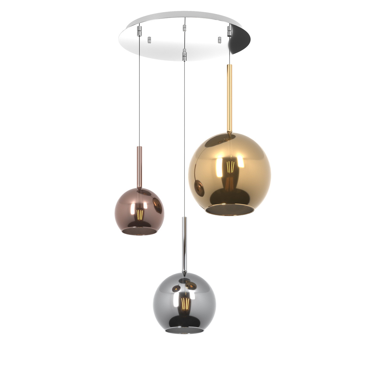 Sospensione 3 luci dal rosone tondo con struttura in metallo finitura cromo e da 3 vetri tutti differenti nelle dimensioni colore multicolor.. Le finiture dei vetri cromo, rame, oro e ambra sono trattamenti superficiali che riducono solo parzialmente l'emissione luminosa. La finitura trasparente può essere naturalmente abbinata alle altre. Le strutture in metallo sono disponibili nelle finiture cromo, bianco e ottone satinato, con il diffusore in vetro disponibile in tutte le finiture esistenti. Possibilità di creare una composizione componibile in base ai componenti della sospensione scelti.Questo articolo è disponibile in diverse finiture e/o dimensioni. E' possibile indicarlo nell'apposito campo NOTE presente in conclusione di ordine oppure contattarci dopo aver effettuato l'ordine.