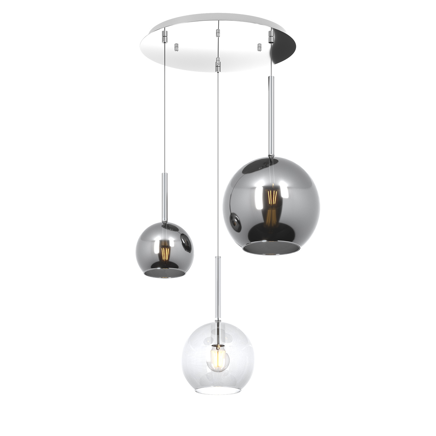 Sospensione 3 luci dal rosone tondo con struttura in metallo finitura cromo e da 3 vetri tutti differenti nelle dimensioni colore trasparente e cromo.. Le finiture dei vetri cromo, rame, oro e ambra sono trattamenti superficiali che riducono solo parzialmente l'emissione luminosa. La finitura trasparente può essere naturalmente abbinata alle altre. Le strutture in metallo sono disponibili nelle finiture cromo, bianco e ottone satinato, con il diffusore in vetro disponibile in tutte le finiture esistenti. Possibilità di creare una composizione componibile in base ai componenti della sospensione scelti.Questo articolo è disponibile in diverse finiture e/o dimensioni. E' possibile indicarlo nell'apposito campo NOTE presente in conclusione di ordine oppure contattarci dopo aver effettuato l'ordine.
