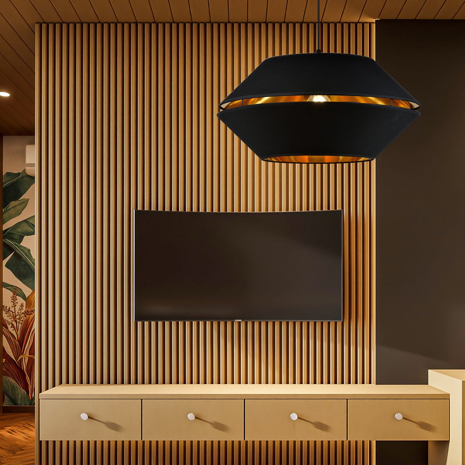 Lampada a sospensione a 1 luce con base in metallo nero e paralume in metallo rivestito in tessuto nero all'esterno e oro all'interno. Altezza regolabile. I suoi originali paralumi con interni dorati conferiscono un carattere unico alle stanze. Crea un'atmosfera magica e suggestiva che irradia calore sensuale. La costruzione semplice e l'elegante palette di colori garantiscono una perfetta armonia tra praticità e raffinatezza.