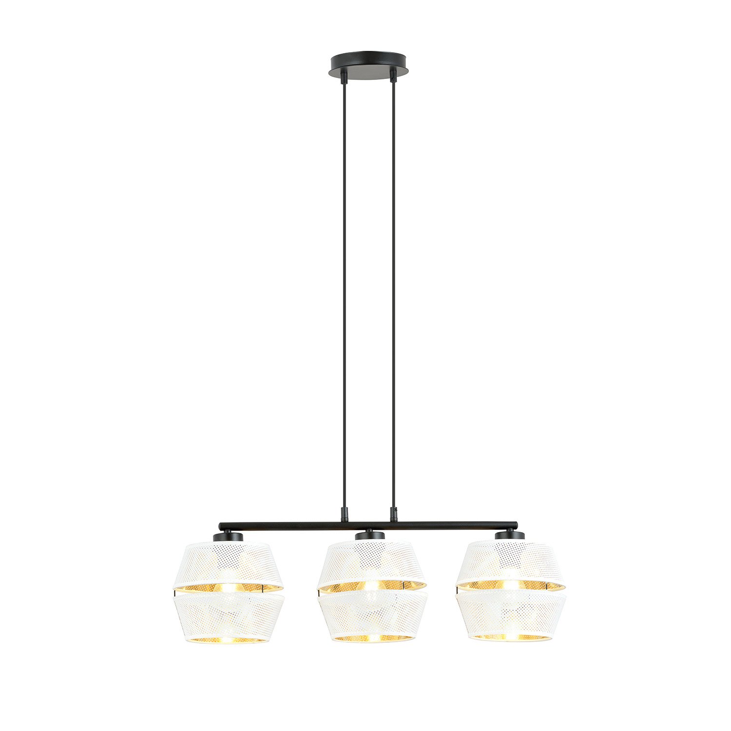 Sospensione contemporanea con base in metallo nero e 3 paralumi in metallo rivestiti in tessuto bianco all'esterno e oro all'interno. Altezza regolabile. I suoi originali paralumi con interni dorati conferiscono un carattere unico alle stanze. Crea un'atmosfera magica e suggestiva che irradia calore sensuale. La costruzione semplice e l'elegante palette di colori garantiscono una perfetta armonia tra praticità e raffinatezza.